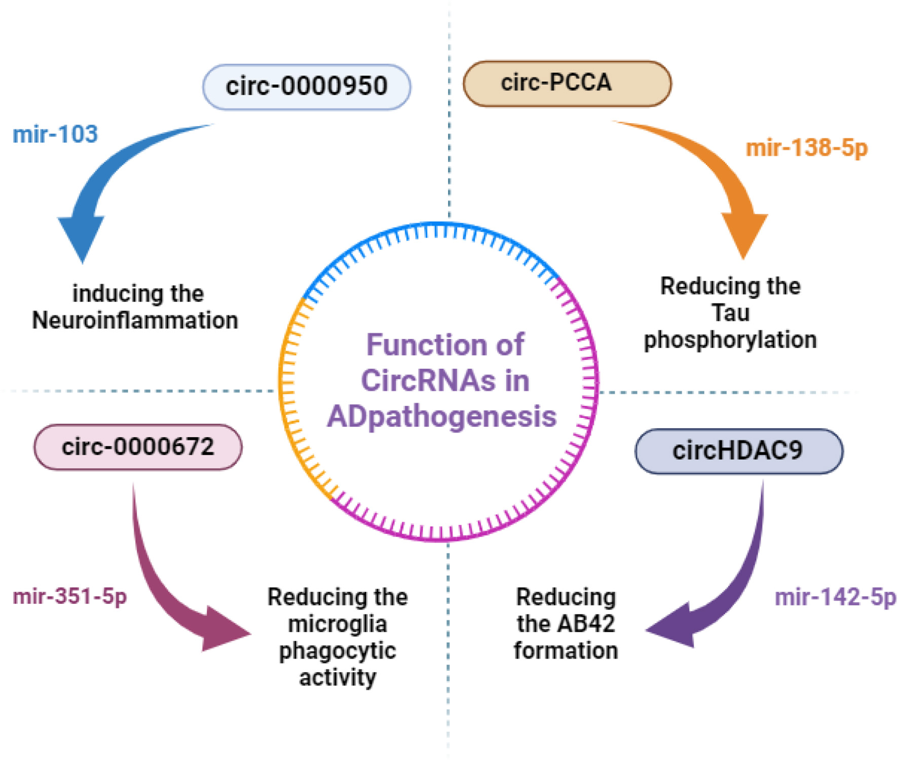 Alzheimer's disease is a progressive neurodegenerative disorder that primarily affects memory, thinking, and behavior (Levites et al., 2023). It is the most common form of dementia, accounting for 60%−80% of cases. As the population ages, the prevalence of Alzheimer's disease continues to rise, becoming a significant public health concern (Levites et al., 2023). While the exact causes of Alzheimer's are still not fully understood, research into genetic, environmental, and cellular factors has illuminated some pathways that might contribute to the onset and progression of this disease (Husain et al., 2021). The majority of research on neurodegenerative diseases has concentrated on the roles of circRNAs in AD (Mo et al., 2020), based on its impact on global public health. In general, patients with AD experience intellectual disabilities and memory loss (Mo et al., 2020). The development of Aβ-42 plaques, neurofibrillary tangles (NFTs) made of hyperphosphorylated tau protein, and neuroinflammation brought on by the activation of microglia cells are the main pathological features of AD (Congdon and Sigurdsson, 2018; Bălaşa et al., 2020). Nemour studies showed that circRNAs directly contribute to the pathology and progression of AD by controlling the brain's inflammatory responses, tau protein accumulation, and Aβ metabolism (Fang et al., 2018; Dolinar et al., 2019).