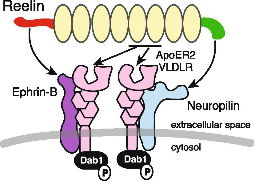 Reelin, canonical receptors, and co-receptors. ApoER2 and VLDLR canonical receptors bind to Reelin at repeats 5 and 6. Ephrin-B and Nrp1 bind to the Reelin NTR and CTR, respectively, and form complexes with canonical receptors. Dab1 is associated with the cytosolic domain of canonical receptors and is phosphorylated when Reelin binds to these receptors.