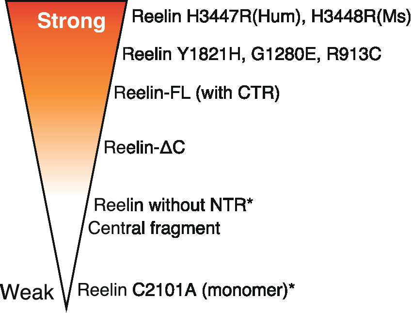 Schematic showing the biological activity (strength) of different Reelin proteins. More intense red refers to strong activity while no shading indicates the opposite. Asterisks indicate artificial proteins. The variant distribution presented in the figure is not representative of the activity magnitude.