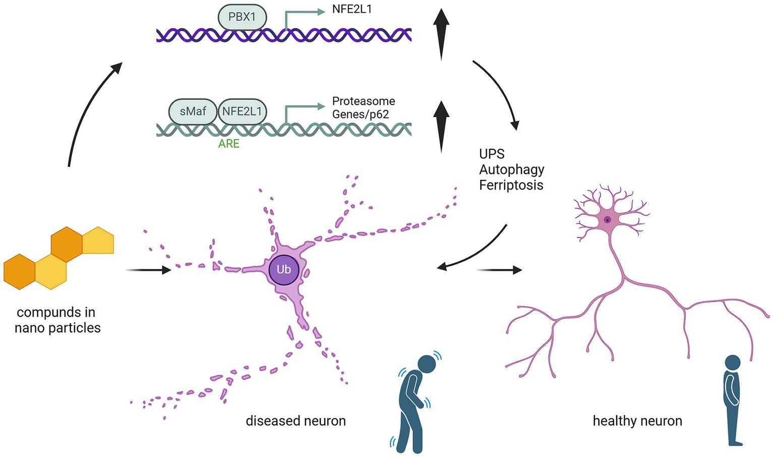Mechanistic pathway of nanoparticle compounds in modulating NFE2L1-mediated neuroprotection. This schematic illustrates the effect of nanoparticle-based compounds on NFE2L1 and its downstream molecular pathways involved in neuronal health. Nanoparticle compounds (represented by compound molecules) potentially could activate the NFE2L1 pathway, leading to the upregulation of PBX1/NFE2L1 transcriptional activity. This activation enhances the Antioxidant Responsive Element (ARE), promoting the expression of antioxidant genes and protecting neurons from oxidative damage. Furthermore, upregulation of sMAF/NFE2L1 induces the activation of proteasomal degradation pathways (including p62-mediated autophagy), facilitating the clearance of damaged proteins and cellular debris. These events contribute to the regulation of ubiquitin-proteasome system (UPS) and autophagy, which are critical for maintaining neuronal homeostasis. The figure also shows the potential cellular impact: healthy neurons are maintained by these protective pathways, while diseased neurons, characterized by ubiquitinated proteins, are at risk of undergoing ferroptosis due to impaired oxidative stress responses and protein clearance. The upregulation of NFE2L1 serves as a potential therapeutic target to modulate these pathways and prevent neurodegeneration.