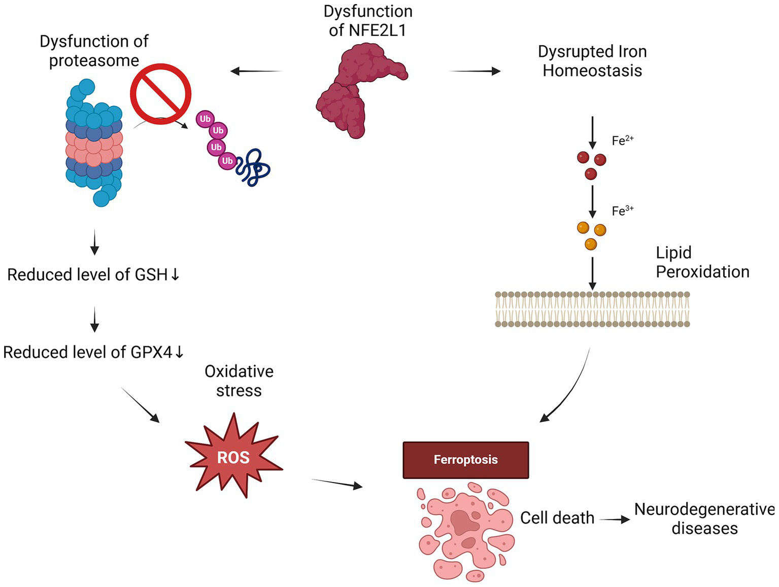 NFE2L1 dysfunction drives ferroptosis through iron dysregulation and oxidative stress. When NFE2L1 is dysfunctional, iron homeostasis is disrupted, leading to iron accumulation, which drives lipid peroxidation and ROS generation. The resulting oxidative damage weakens cellular membranes, while proteasome dysfunction leads to the accumulation of damaged proteins and oxidative stress. The loss of GPX4 activity and reduced GSH levels further impair antioxidant defenses, making neurons highly susceptible to ferroptosis. This cascade of events can contribute to neurodegeneration in conditions such as AD, PD and ALS.