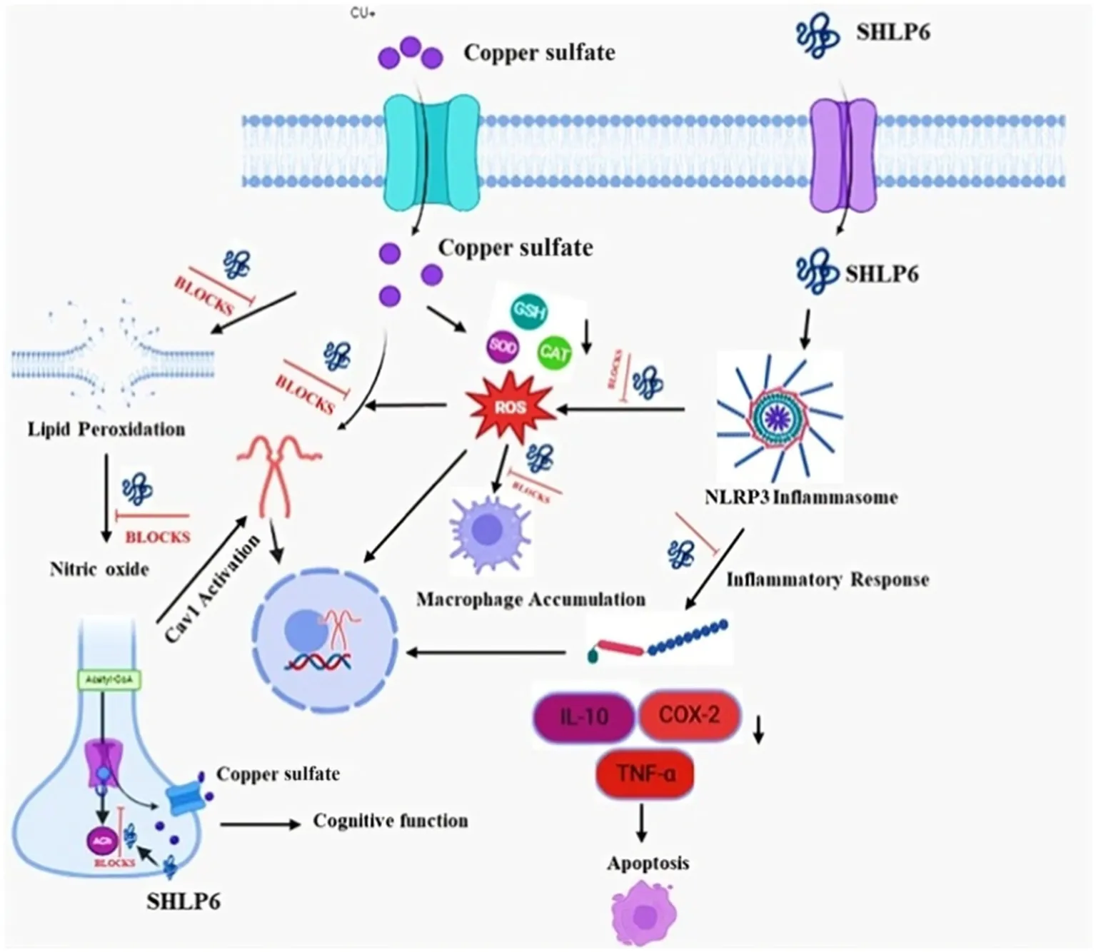 SHLP-6 upregulated TNF-α (2.16-fold), NLRP3 (1.78-fold), and COX-2 (0.705-fold), while increasing IL-10 (1.84-fold), suggesting neuroinflammation modulation. Antioxidant gene expression (SOD, CAT, GST, and GSH) was significantly upregulated. These findings indicate SHLP-6’s potential as a neuroprotective and antioxidant agent against copper sulfate-induced toxicity.