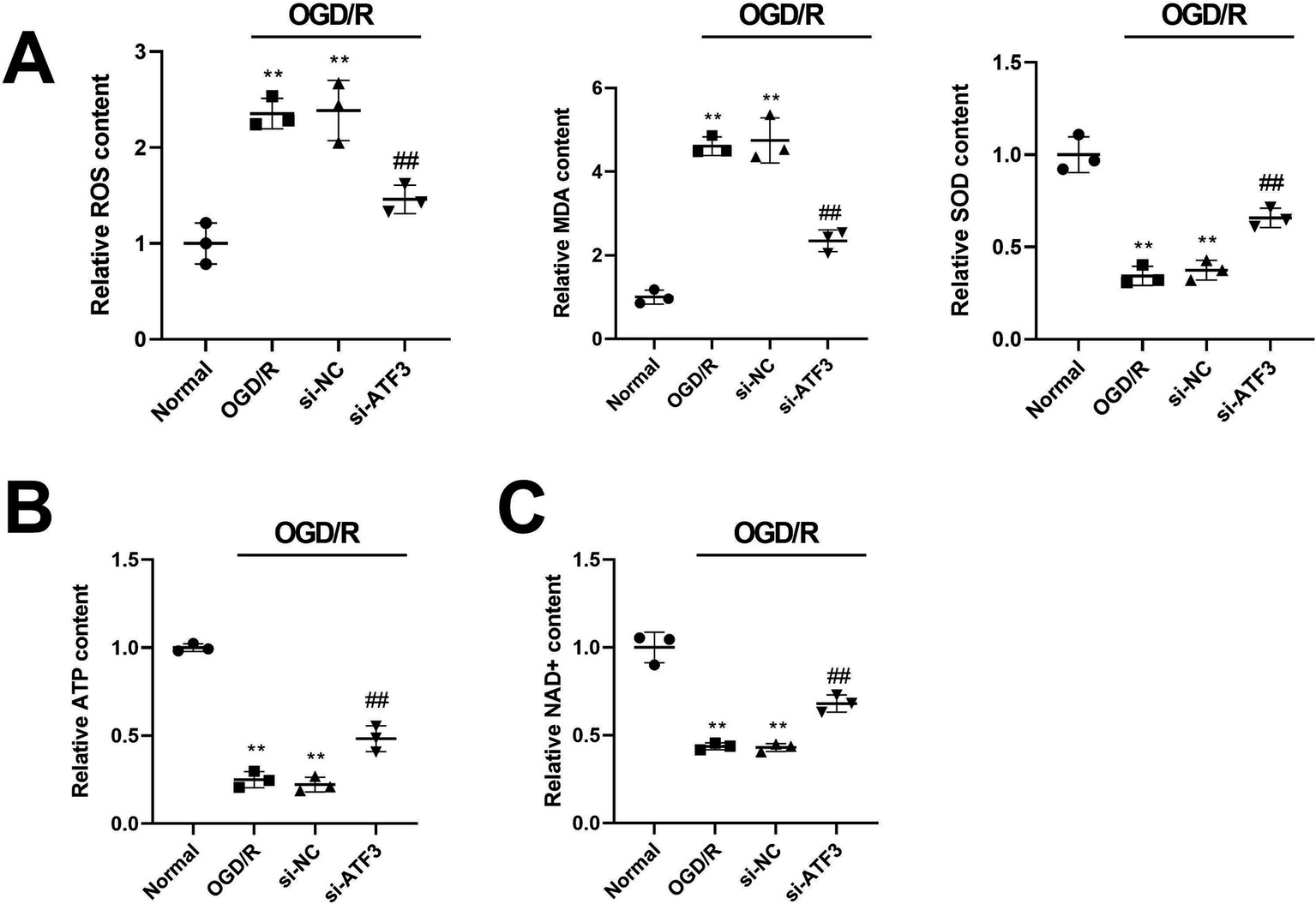 Silencing ATF3 expression improves mitochondrial function in OGD/R-treated HT22 cells. (A) ELISA measures the production of ROS, MDA, and SOD in OGD/R-treated HT22 cells after silencing ATF3. (B,C) ELISA detects the concentrations of mitochondrial functional markers ATP and NAD + in OGD/R-treated HT22 cells after silencing ATF3. **p < 0.01, vs. normal group. ##p < 0.01, vs. OGD/R or si-NC group.