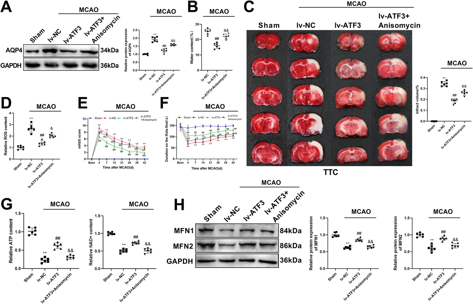 ATF3 affects ischemic stroke development and improves mitochondrial homeostasis through the MAPK pathway in rats. (A) Western blot determines the expression of AQP4 in lv-ATF3 rats after administration of anisomycin. (B) Brain water content of lv-ATF3 rats after administration of anisomycin. (C) TTC staining displays the degree of infarction of the brain in lv-ATF3 rats after using anisomycin. Scatter plots are generated to show infarct volume (%) of rats. (D) ELISA detects the content of ROS in the brain of lv-ATF3 rats after using anisomycin. (E) Neurological assessment (mNSS score) before MCAO and after MCAO (4, 7, 14, 21, 28, 35 and 42 days) in lv-ATF3 + anisomycin group. (F) Duration on the rota-rod before MCAO and after MCAO (4, 7, 14, 21, 28, 35 and 42 days) in lv-ATF3 + anisomycin group. (G) ELISA measures the levels of ATP and NAD + in the brain of lv-ATF3 rats after using anisomycin. (H) Western blot determines the levels of MFN1 and MFN2 in the brain of lv-ATF3 rats after using anisomycin. **p < 0.01, vs. sham group. ##p < 0.01, vs. lv-NC group. &p < 0.05 and &&p < 0.01, vs. lv-ATF3 group.