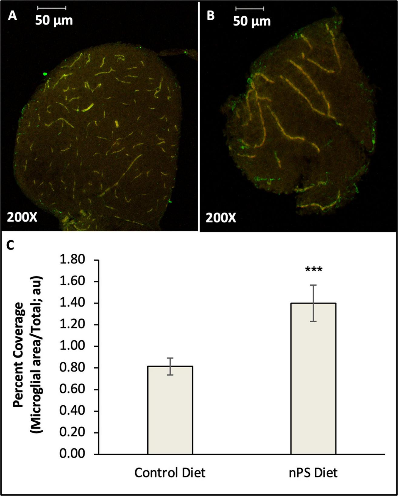 Future studies will be important for understanding the progression of microglial and astrocytic responses to a nanoplastic-contaminated diet over the course of longer exposures. Additionally, the responses to other types of common nanoplastics besides polystyrene, such as polypropylene and polyethylene will better inform understanding of how current trends in nanoplastic pollution may affect the brains of humans and other animals exposed to nanoplastics through dietary exposures.