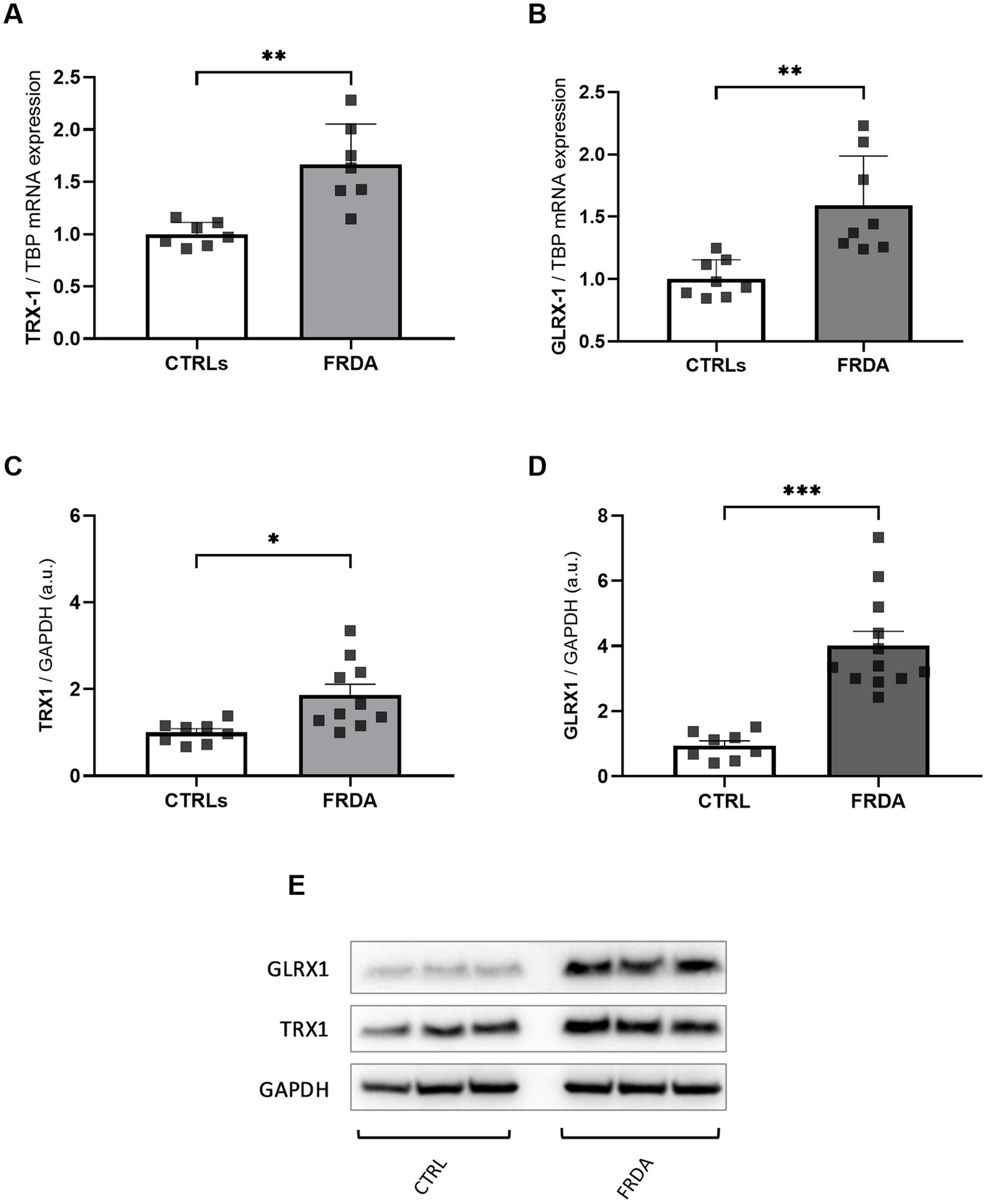 mRNA (A,B) and protein (C,D) levels of TRX1 and GLRX1 in n.3 FRDA fibroblasts and n.3 control subjects, as determined by qRT-PCR and Western blot analysis, respectively. (E) Representative Western blot of TRX1, GLRX1, and GAPDH (as loading control). Data are expressed as mean ± SEM. Statistical significance was determined by Student’s t test and defined as *p < 0.05, **p < 0.01, ***p < 0.001 respect to controls.