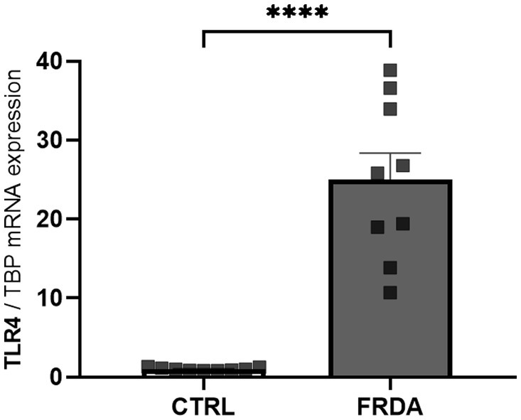 qRT-PCR analysis of toll-like receptor 4 (TLR4) expression in n. 3 FRDA fibroblasts and n. 3 controls (CTRLs). Values are expressed as mean ± SEM. Statistical significance was determined by Student’s t test and defined as ****p < 0.0001 respect to controls.