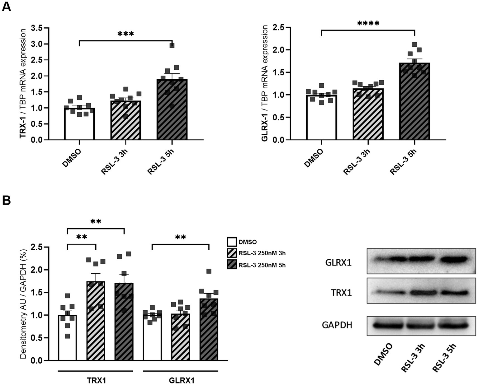 mRNA (A) and protein levels (B) of TRX1 and GLRX1 in control fibroblasts after RSL-3 treatment. A representative Western blot of TRX1 and GLRX1 is also reported. Values are expressed as mean ± SEM. Statistical analyses were performed by ANOVA and significance was defined as *p < 0.05, **p < 0.01, ***p < 0.001 and ****p < 0.0001 respect to controls.