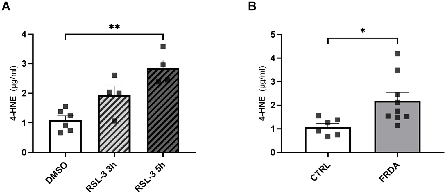 Overall, these previous evidences support the importance to investigate inflammation in FRDA, not only to provide new insights into the knowledge of the disease pathogenesis, but also aimed at developing novel therapeutic approaches in this neurodegenerative disease. Furthermore, it must be considered that inflammation and ferroptosis are closely inter-connected (He et al., 2024) and, importantly, 4-HNE, the main ferroptosis hallmark, has been shown to play a critical role in the function of TLR4 (Kim et al., 2009; Wang et al., 2019). Therefore, the systemic increase of 4-HNE that we previously reported in blood of patients with FRDA (La Rosa et al. 2020b), together with the high 4-HNE levels in FRDA fibroblasts and its time-dependent increase following the ferroptosis induction, strongly support the hypothesis of 4-HNE as a potential mediator between ferroptosis and inflammation in FRDA.