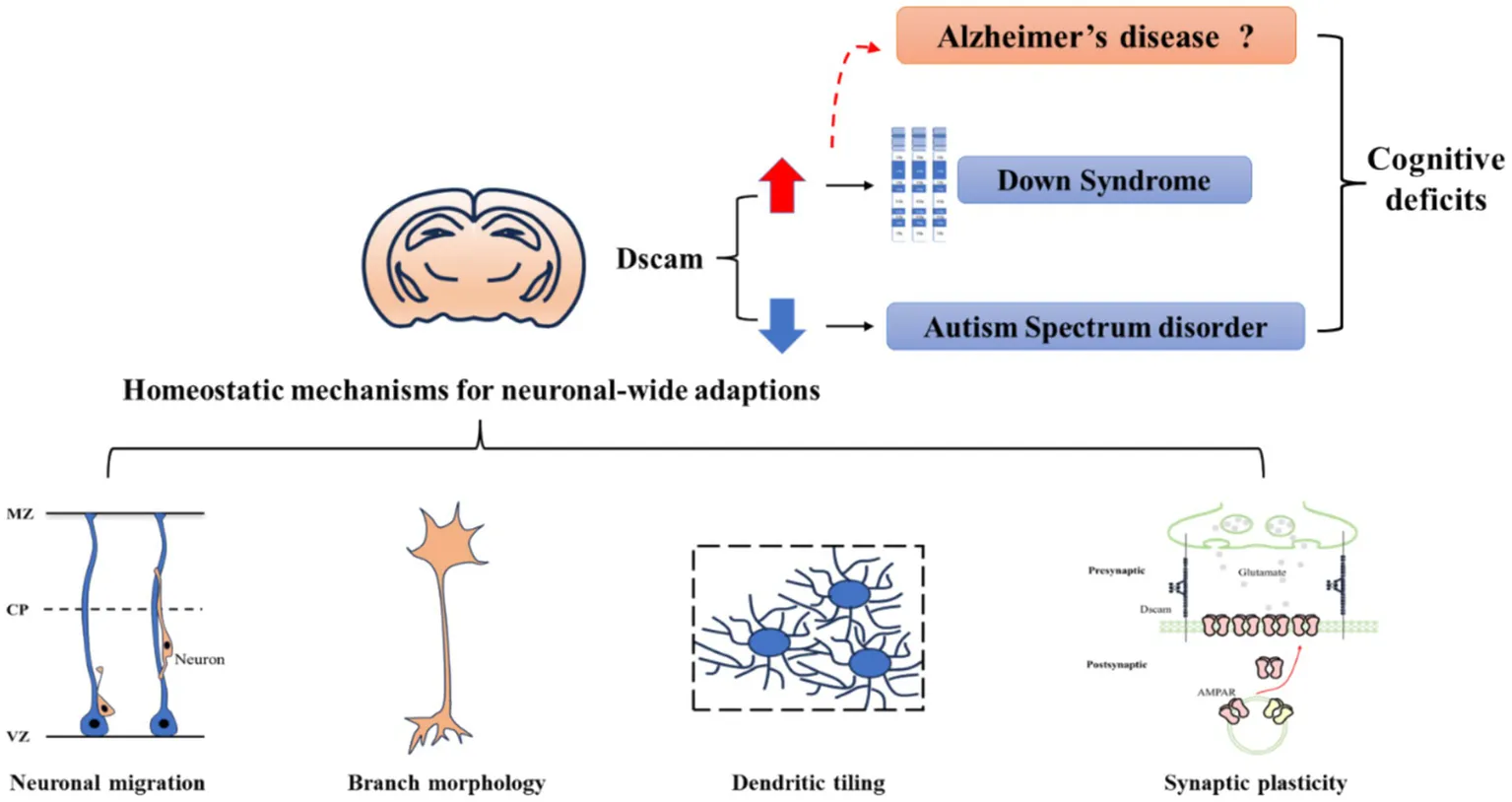 AD is a neurodegenerative disease marked by progressive cognitive and behavioral problems. Remarkably, individuals with DS are more susceptible to developing early-onset AD later in life, although the principal cause of cognitive decline in AD is the overexpression of amyloid precursor protein (APP) (Hergenreder et al., 2024). It is widely acknowledged that studying AD via the DS model would help track its onset and decipher preclinical mechanisms (Martinsson et al., 2022; Head et al., 2007). Research indicates in DS patients with AD, DSCAM expression is localized to regions associated with senile plaque formation (Head et al., 2007). Moreover, in APP transgenic mice, the level of Dscam expression in the cerebral cortex and hippocampus was significantly elevated and progressively increased with age (Jia et al., 2017; Jia et al., 2011). Recent comprehensive big data analyses have further spotlighted Dscam as a candidate gene contributing to the genetic predisposition for early-onset AD (Li et al., 2023; Niu et al., 2023). Therefore, it’s plausible that Dscam might be one of the key molecules involved in neuronal age-related compensatory mechanisms during AD’s early stage. However, regrettably, only limited research has focused on clarifying the precise function of Dscam in AD pathology, an area that urgently demands the attention of the scientific community. There appears to be an intricate functional interplay between APP and Dscam, as the Drosophila homolog of APP promotes Dscam expression post-transcriptionally to drive axon growth (Pizzano et al., 2023). Given disrupted synaptic homeostasis with amyloid-β (Aβ), several scientific questions arise: whether Aβ-induced neurotoxicity is the direct cause of elevated expression of Dscam? Whether Dscam accelerate AD pathology by decreasing resistance to Aβ-dependent neuronal hyperactivity? How Dscam-mediated homeostatic synaptic plasticity works in AD pathology? With future rigorous investigations, these crucial questions will be meticulously and progressively dissected, holding great promise for the development of novel treatments for AD.
