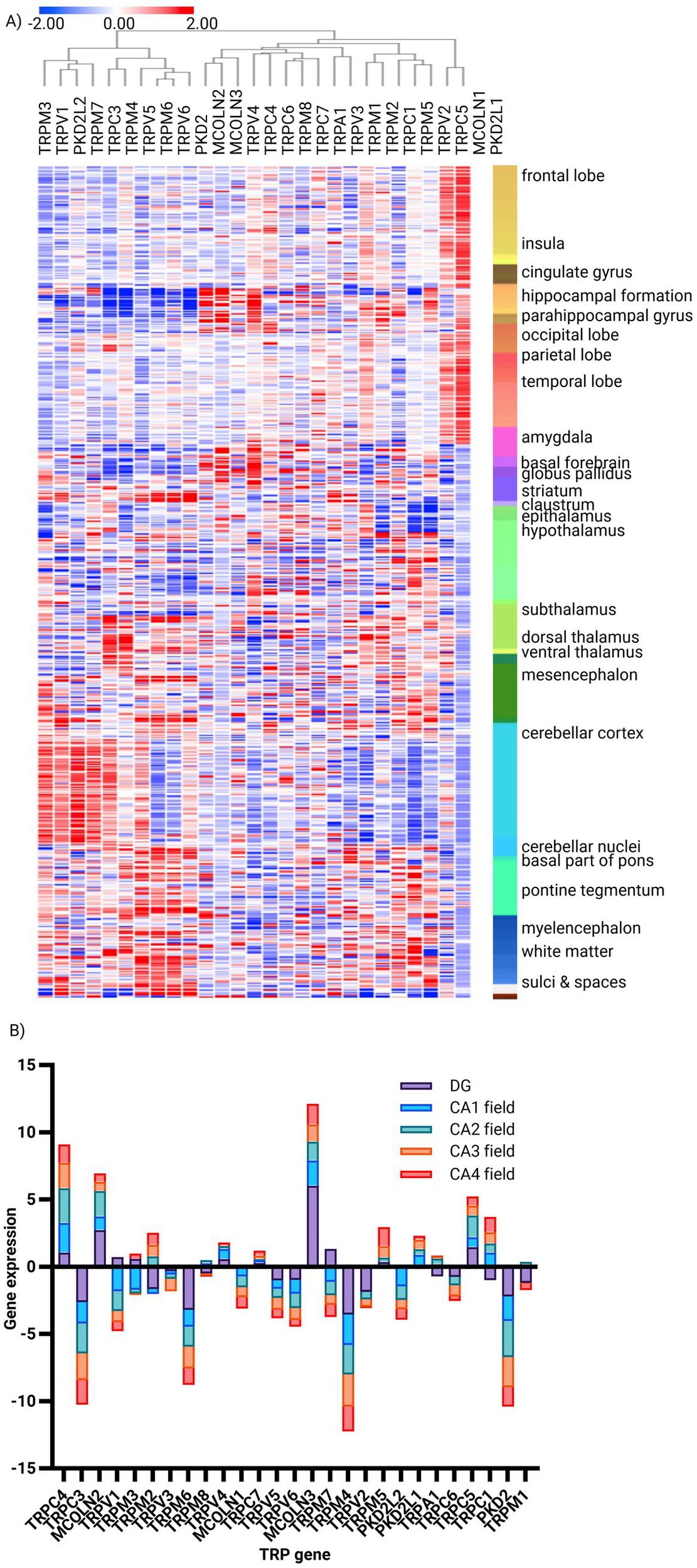 Expression signature of TRP family genes in human brain structures. (A) Unsupervised hierarchical clustering of TRP gene expression (n = 27) signatures in human brain structures (structures n = 160, donor n = 6), generated using the Human Protein Atlas. Method: Metric—one minus Pearson, linkage method—complete (z-score). (B) Bar plot of the most and least enriched TRP genes (n = 27) in the human hippocampus, based on gene enrichment analysis using the Human Brain Atlas. Method: Normalized read counts (z-score).
