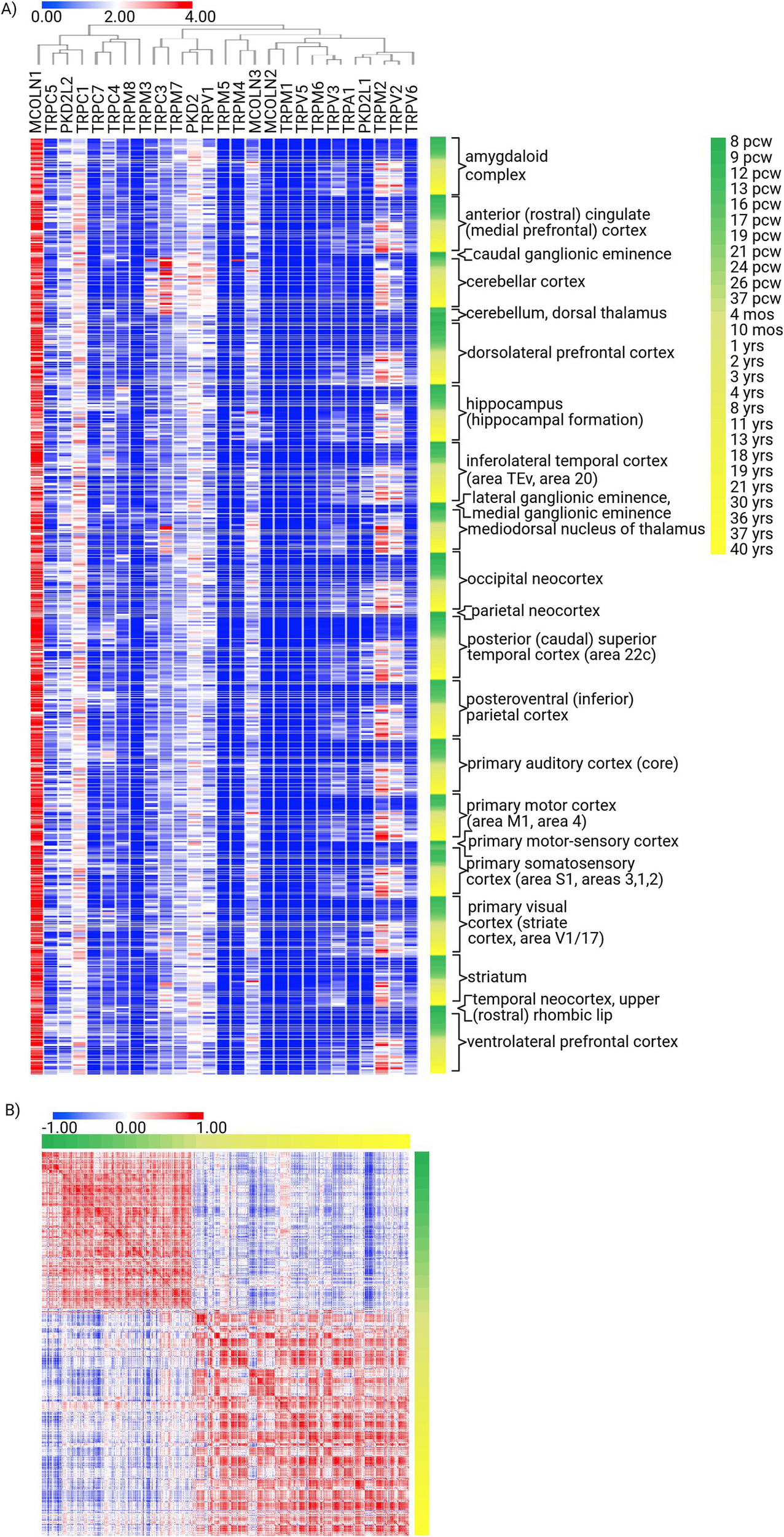 Expression signature of TRP family genes in the structures of the human developing brain. (A) Unsupervised hierarchical clustering of TRP gene expression (n = 27) signatures in human brain structures during development [8 weeks post-conception (pcw) to 40 years old; structures n = 25, donors n = 41], generated using the Developing Human Brain Atlas. Method: Metric—one minus Pearson correlation, linkage method—complete (log2). (B) Similarity matrix of TRP gene expression (n = 27) in human brain structures during development (n = 25), computed as the cross-distance matrix. Method: Pearson correlation.