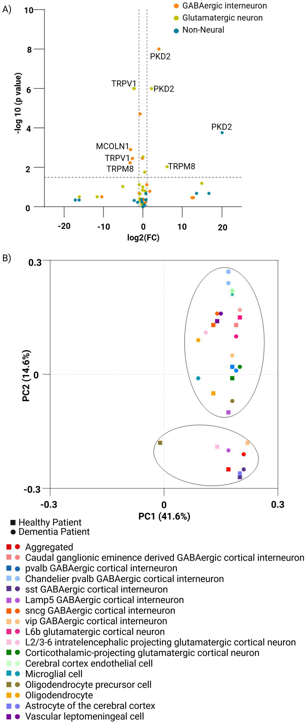 Comparison of the expression of TRP family genes across human normal and dementia brain cells. (A) Volcano plot of TRP gene expression (n = 27) comparing neuronal and non-neuronal cell types in the human forebrain under healthy and dementia conditions. Healthy samples (n = 23,822 single-nucleus transcriptomes) were analyzed based on 4,020 differentially expressed genes, derived from the Allen Brain Map. Dementia samples originate from post-mortem brain specimens (n = 5) and include 166,868 single-nucleus transcriptomes from The Seattle Alzheimer’s Disease Brain Cell Atlas (SEA-AD). (B) PCA plot using the ClustVis platform generated by the study for the family of TRP genes (n = 27) in a set of cells from healthy (n = 11,164,441) and dementia (n = 1,052,021) patient brains covering different cell types from the middle temporal gyrus and the dorsolateral prefrontal cortex regions of the brain (n = 17) feature using CZ CELLxGENE Discover Platform. Principal components PC1 and PC2 explain 41.6 and 14.6% of the variance, respectively. Distinct symbols and colors represent brain cell types, while healthy and dementia samples are indicated by square and circular markers, respectively.