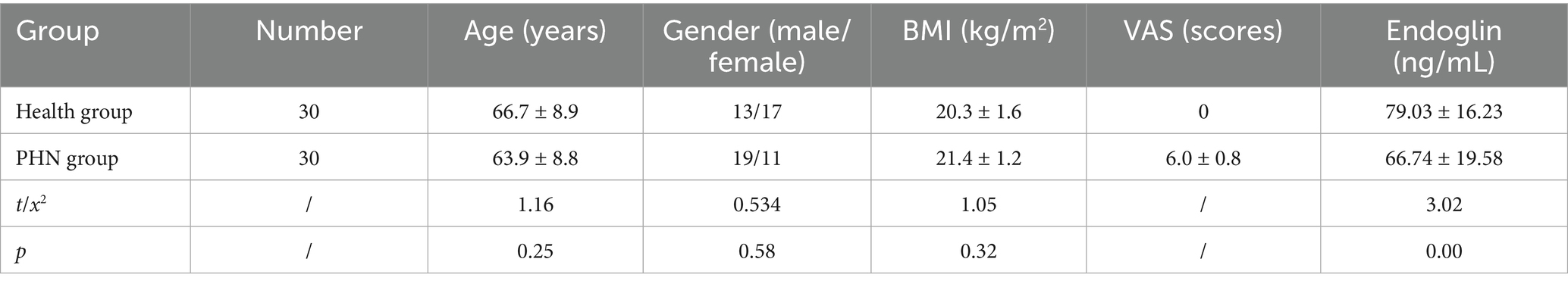 Next, we recruited 30 healthy volunteers and 30 PHN patients and measured their peripheral blood endoglin levels to further validate the differential expression of endoglin in PHN patients. The results showed that the peripheral blood endoglin levels of PHN patients were significantly lower than those of healthy volunteers (Figure 1E). In addition, the visual analog scale (VAS) scores of PHN patients were significantly higher than those of healthy subjects, but no significant differences in age, gender or body mass index (BMI) were observed between the two groups (Table 1).