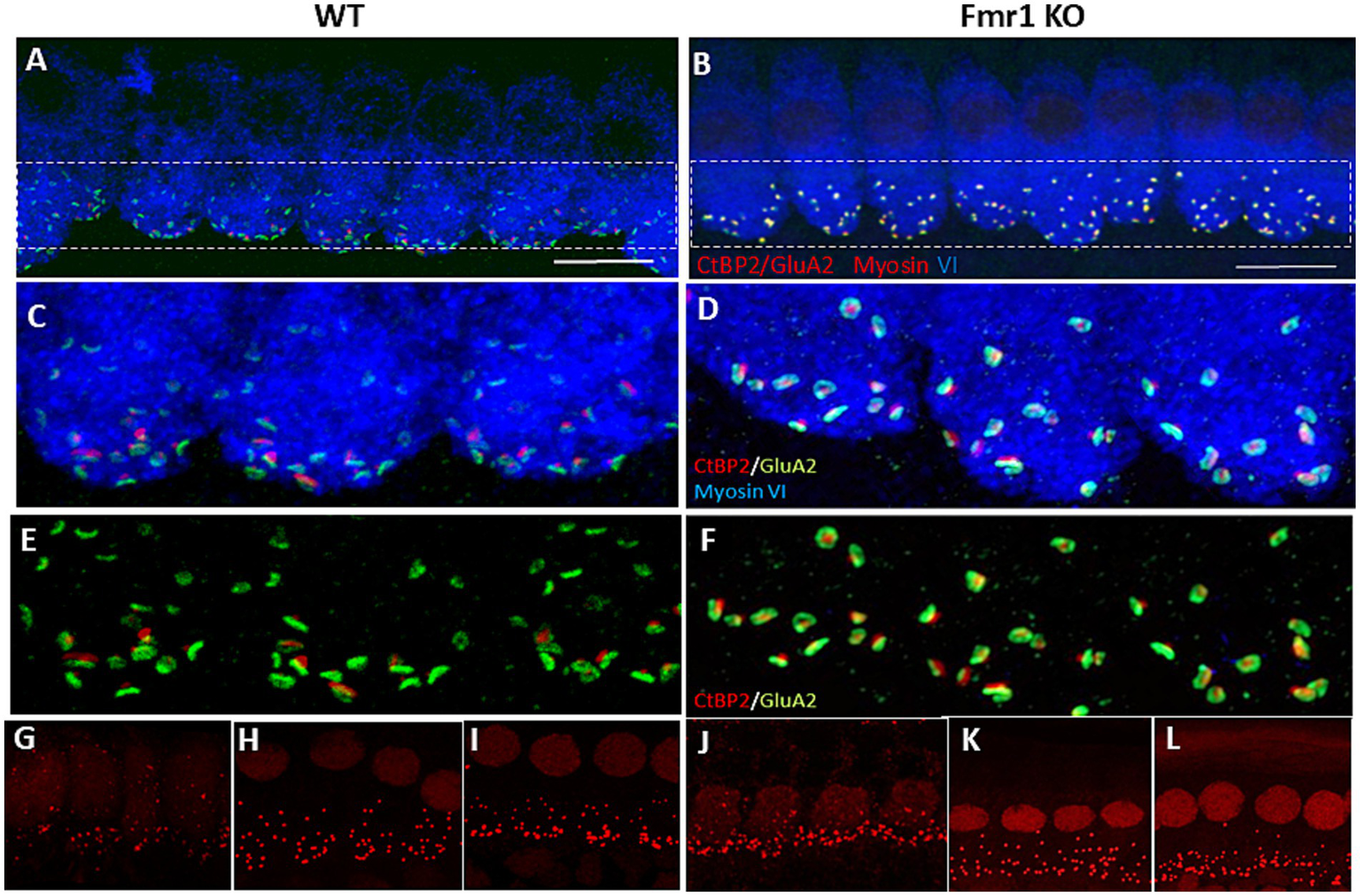 Immunofluorecent staining of IHCs and ribbon synapses in WT and Fmr1KO mice. (A,B) Representative images of the IHC of the organ of Corti’s from P48 mice. White rectangular region is enlarged on (C,D) (63× objective). The basal part of the cell containing multiple synaptic contacts, a presynaptic marker, CtBP2 (red dots), a postsynaptic marker, GluA2 (green dots). (E,F) Enlargement of the synaptic layer of IHC, synapses are visible as red and green dots. (G–L) Visualization of synaptic ribbons at P5 (G,J), P14 (H,K) and P48 (I,L) hair cells in WT and Fmr1KO mice with anti-CtBP2 antibody. The CtBP2 protein is present in ribbon synapses and cell nuclei. Scale bar 10 μm.