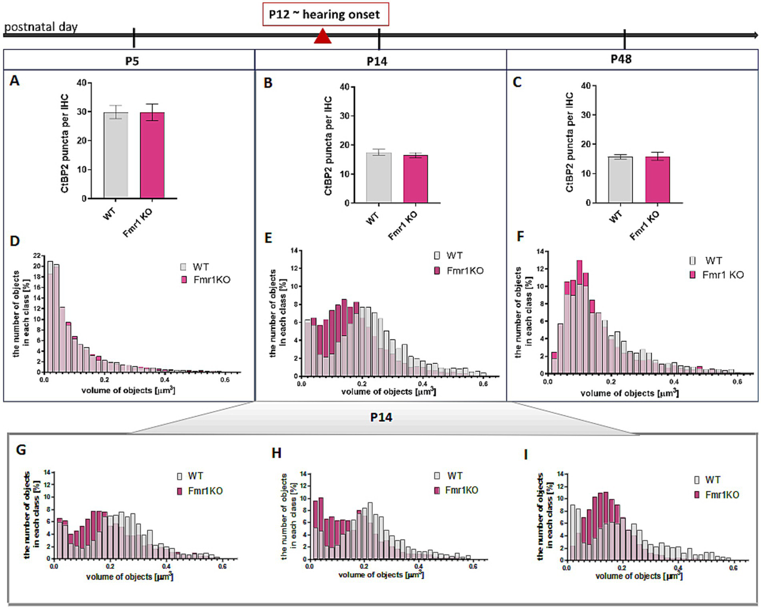 Histograms representing the distribution of average synapse volume at P5 indicated that ribbons were comparable between wild-type and Fmr1KO animals at the early developmental stage before hearing onset (Figure 4D).