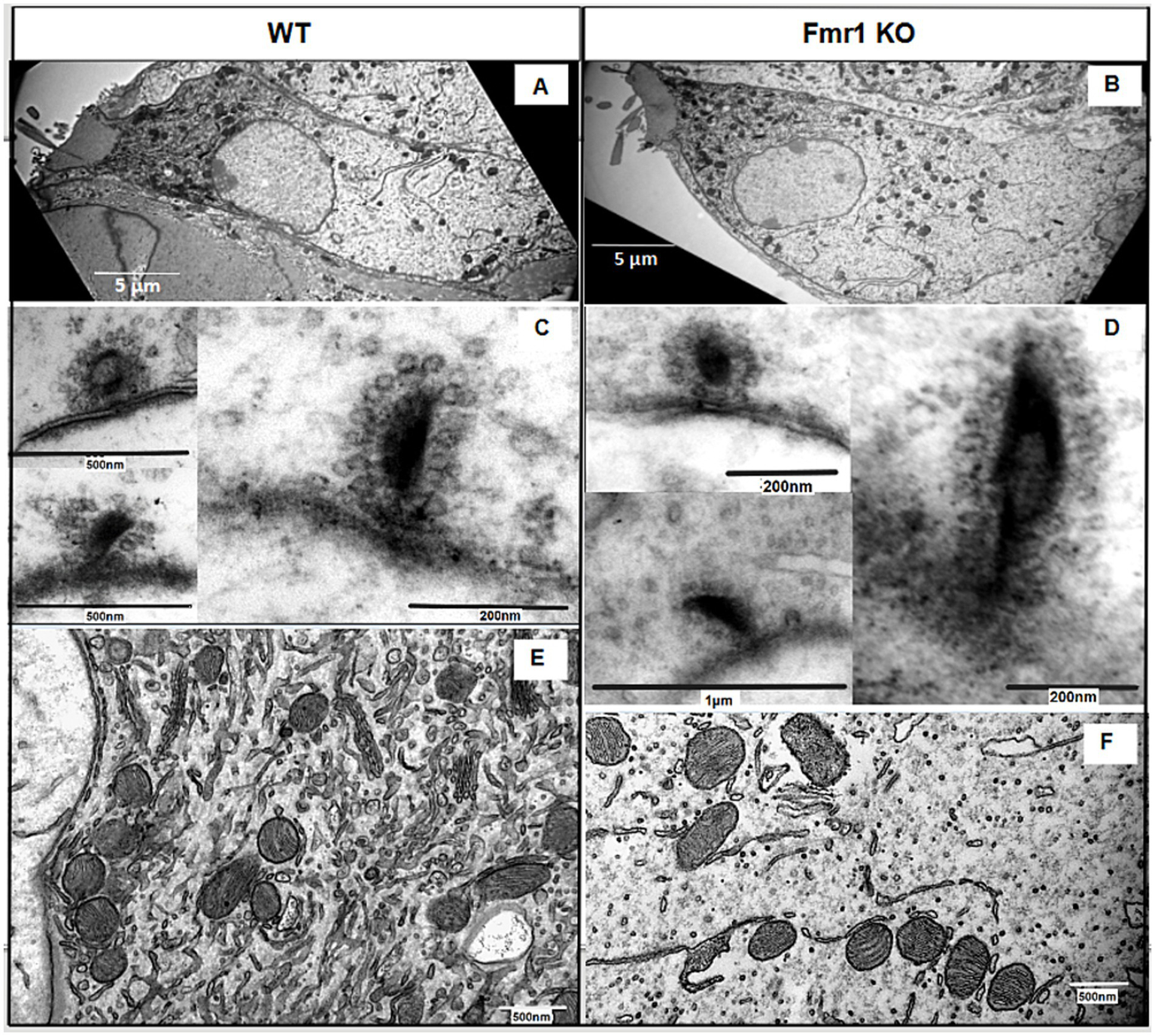 Next, we investigated the ultrastructure of Fmr1 KO inner hair cells using transmission electron microscopy. Figure 5 presents representative images of IHCs from both Fmr1 KO and wild-type (WT) cochleae. The overall morphology of Fmr1 KO IHCs appeared comparable to that of WT cells, with well-defined stereocilia (Figures 5A,B). The shape of the Fmr1 KO IHCs, as well as the distribution of mitochondria and the nucleus, was similar to that observed in WT IHCs.