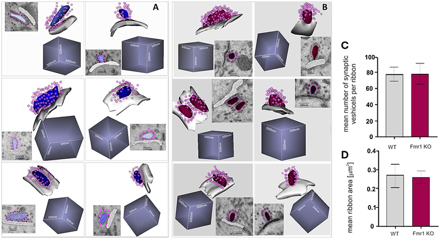 Ultrastructure of reconstructed ribbon synapses from WT (A) and Fmr1KO (B) organ of Corti revealed by SBF-SEM. Mean number of synaptic vesicles per ribbon (C) and mean ribbon area (D) (n = 6 synapses/genotype). The length of the side of the cube in each reconstruction is 500 nm.
