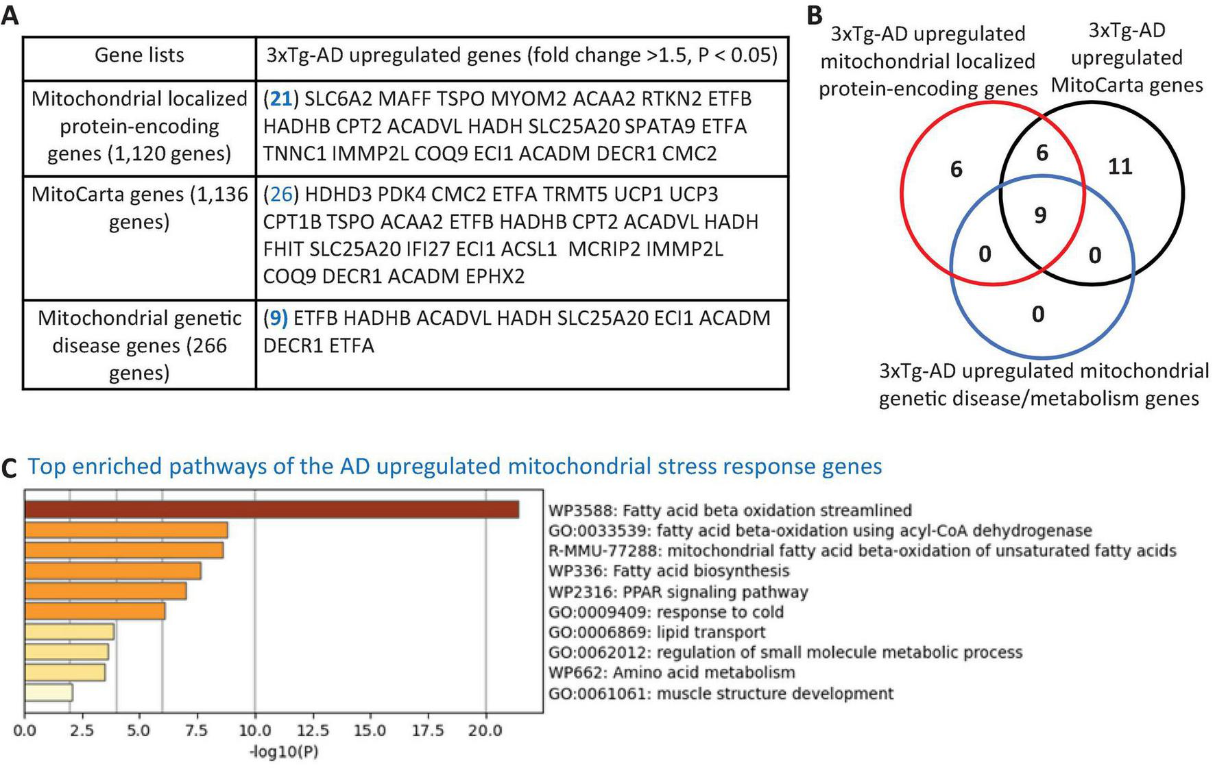 Transcriptional evidence of mitochondrial stress response activation in the 3xTg-AD mouse brain. (A) The 3xTg-AD mouse brain exhibit upregulation of 21 mitochondrial-localized protein-encoding genes, 26 nuclear-encoded mitochondrial genes (MitoCarta, Broad Institute), and 9 genes linked to mitochondrial genetic disorders, indicating a potential induction of mitochondrial stress in the AD brain. (B) Venn diagram illustrating the overlap among upregulated mitochondrial localized genes, MitoCarta genes, and mitochondrial genetic disease/metabolism genes in the 3xTg-AD brain. (C) Metascape pathway analysis reveals significant enrichment of mitochondrial fatty acid beta-oxidation pathways in the 3xTg-AD brain. The 1,120 mitochondrial-localized genes were sourced from the HPA, Mitocarta genes (1,136 nuclear-encoded mitochondrial genes) were retrieved from the Broad Institute (https://www.broadinstitute.org/mitocarta/mitocarta30-inventory-mammalian-mitochondrial-proteins-and-pathways), and a curated list of 266 genes linked to mitochondrial genetic disorder and metabolism were compiled from PMID: 29233888.