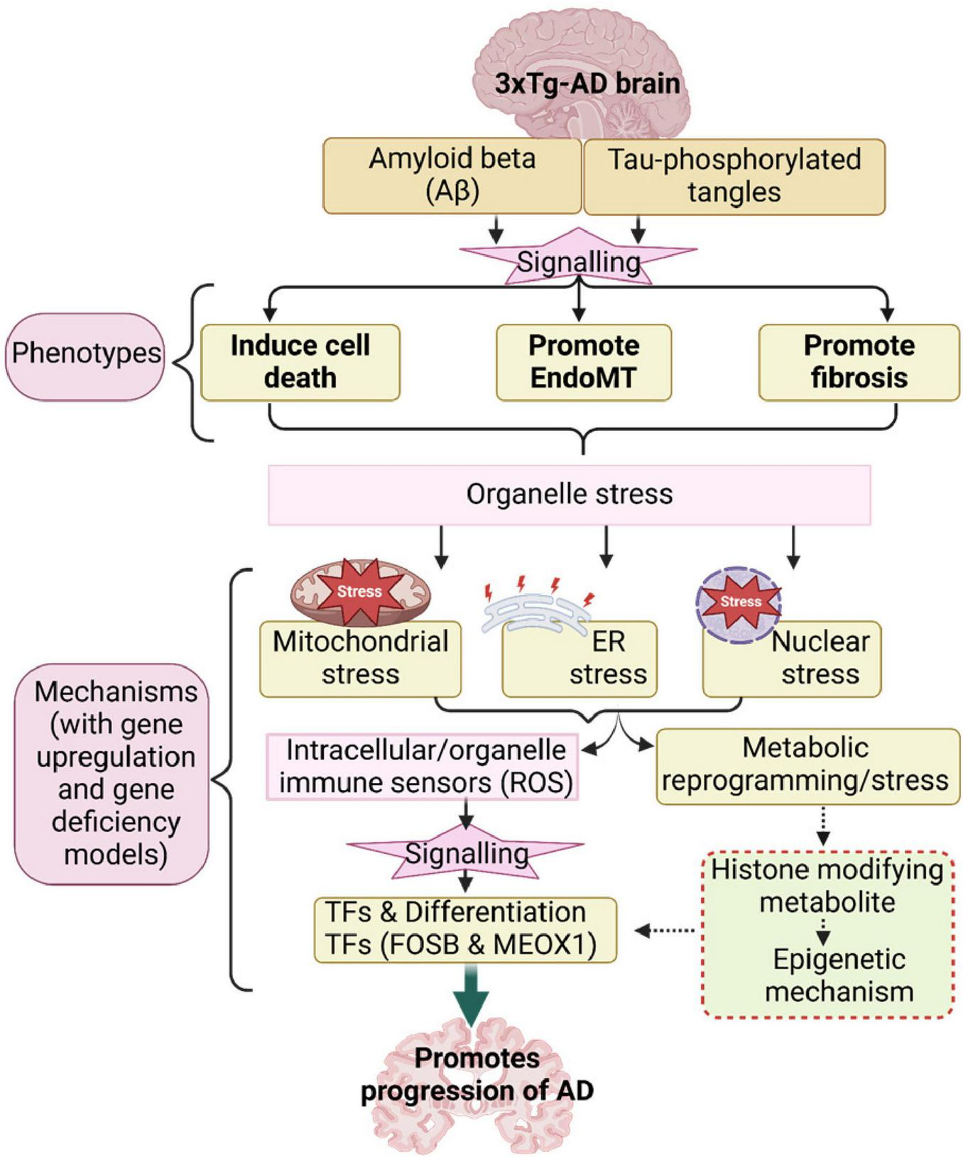 Despite substantial progress, several critical questions remain, highlighting gaps in our knowledge and avenues for further investigation. These questions include whether the transcriptome of the EndoMT pathway is reprogramed in AD, whether the expression of all 14 cell death type regulators remains unchanged in AD, and whether the expression of fibrosis and fibroblast regulators is altered in AD. Using our novel knowledge-based transcriptomic analysis approach, single-cell RNA-seq data from the Single Cell Portal database, and our unpublished data, we have made significant findings. Our research reveals that the 3xTg-AD induces EndoMT, triggers multiple forms of cell death, and promotes fibrosis and fibroblast proliferation in the brain. We have also identified five potential mechanisms—mitochondrial stress, ER stress, nuclear stress, metabolic reprogramming, and catabolic stress—that contribute to EndoMT, cell death, and fibrosis. These mechanistic insights provide new understanding of how AD-related processes are driven by organelle stress and bioenergetic alterations.