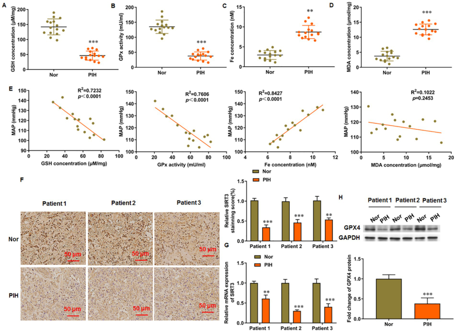 Levels of ferroptosis related genes in placenta of patients with PIH. Placental tissues were collected from patients with PIH (N = 15) and physiologically normal pregnancies subjects (N = 15). (A) GSH content. (B) GSH-Px activity. (C) Total Fe (II) content. (D) MDA level. (E) Correlation analysis between maternal mean arterial pressure (MAP) and levels of ferroptosis markers in patients with PIH. (F) Representative images of immunohistochemistry of SIRT3 in placental tissue. Scale bar = 50 μm. (G) SIRT3 level in placental tissue was detected by RT-qPCR. (H) Protein levels of GPX4 was detected by Western blot analysis. Placental samples were obtained from patients with PIH (N = 3) and subjects with physiologically normal pregnancy (N = 3). **p < 0.01 and ***p < 0.001.