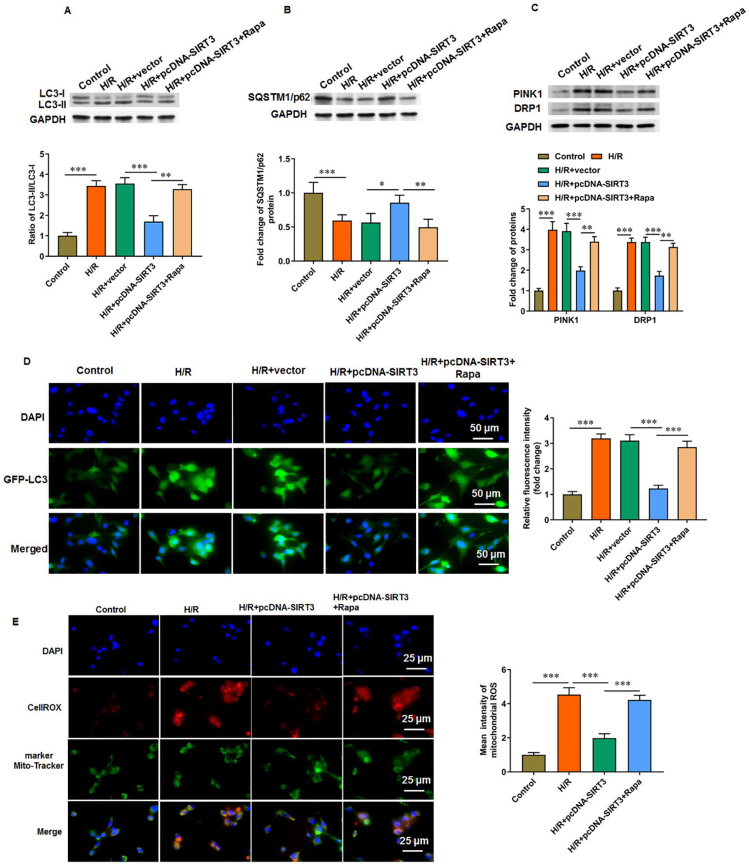 SIRT3 inhibits H/R-induced autophagy in HUVECs. H/R-treated HUVECs were transfected with pcDNA-SIRT3 alone or co-treated with rapamycin (Rapa). (A) Protein levels of LC-3II and LC-3I. (B) Protein levels of SQSTM1/p62. (C) Protein levels of PINK1 and DRP1. (D) Representative images of immunofluorescence of autophagy specific protein LC-3II. Scale bar = 50 μm. (E) Mitochondrial ROS levels were evaluated by CO-staining of mitochondrial marker Mito tracker and cellrox (a ROS indicator). Scale bar = 25 μm. Rapamycin was used to activate autophagy (N = 3). *p < 0.05, **p < 0.01, and ***p < 0.001.