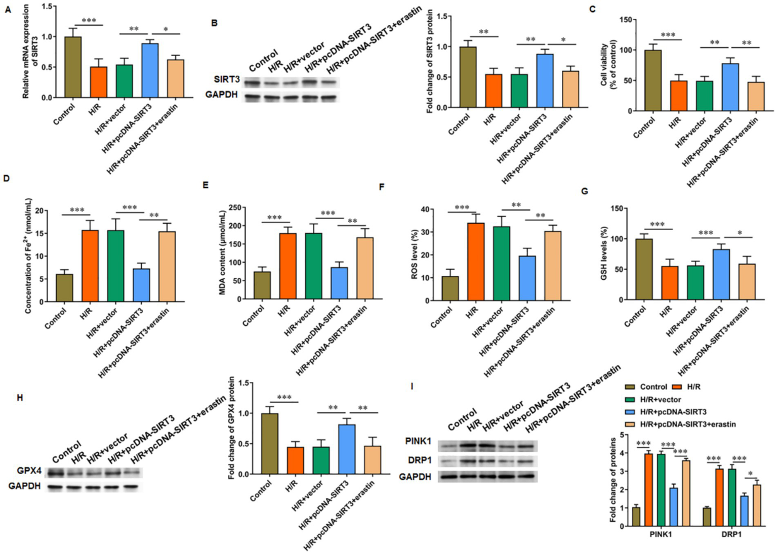 SIRT3 inhibits H/R-induced ferroptosis in HUVECs. H/R-treated HUVECs were transfected with pcDNA-SIRT3 alone or co-treated with erastin. (A,B) The mRNA and protein levels of SIRT3. (C) Cell viability. (D) Fe2+ content. (E) MDA content. (F) ROS levels. (G) GSH content. (H) Protein levels of GPX4. (I) Protein levels of PINK1 and DRP1. Erastin was used to activate ferroptosis (N = 3). *p < 0.05, **p < 0.01, and ***p < 0.001.