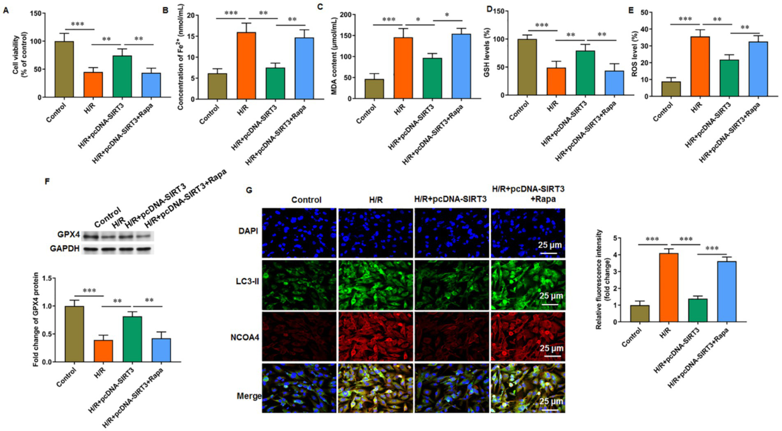 SIRT3 inhibits H/R-induced autophagy-dependent ferroptosis in HUVECs. H/R-treated HUVECs were transfected with pcDNA-SIRT3 alone or co-treated with rapamycin (Rapa). (A) Cell viability. (B) Fe2+ content. (C) MDA content. (D) GSH content. (E) ROS levels. (F) Protein levels of GPX4. (G) Representative images of immunofluorescence of LC-3II colocalized with NCOA4. Erastin was used to activate ferroptosis. Nuclear receptor coenzyme activating factor 4 (NCOA4) is a key receptor for iron autophagy. Rapamycin was used to activate autophagy. Scale bar = 25 μm (N = 3). *p < 0.05, **p < 0.01, and ***p < 0.001.