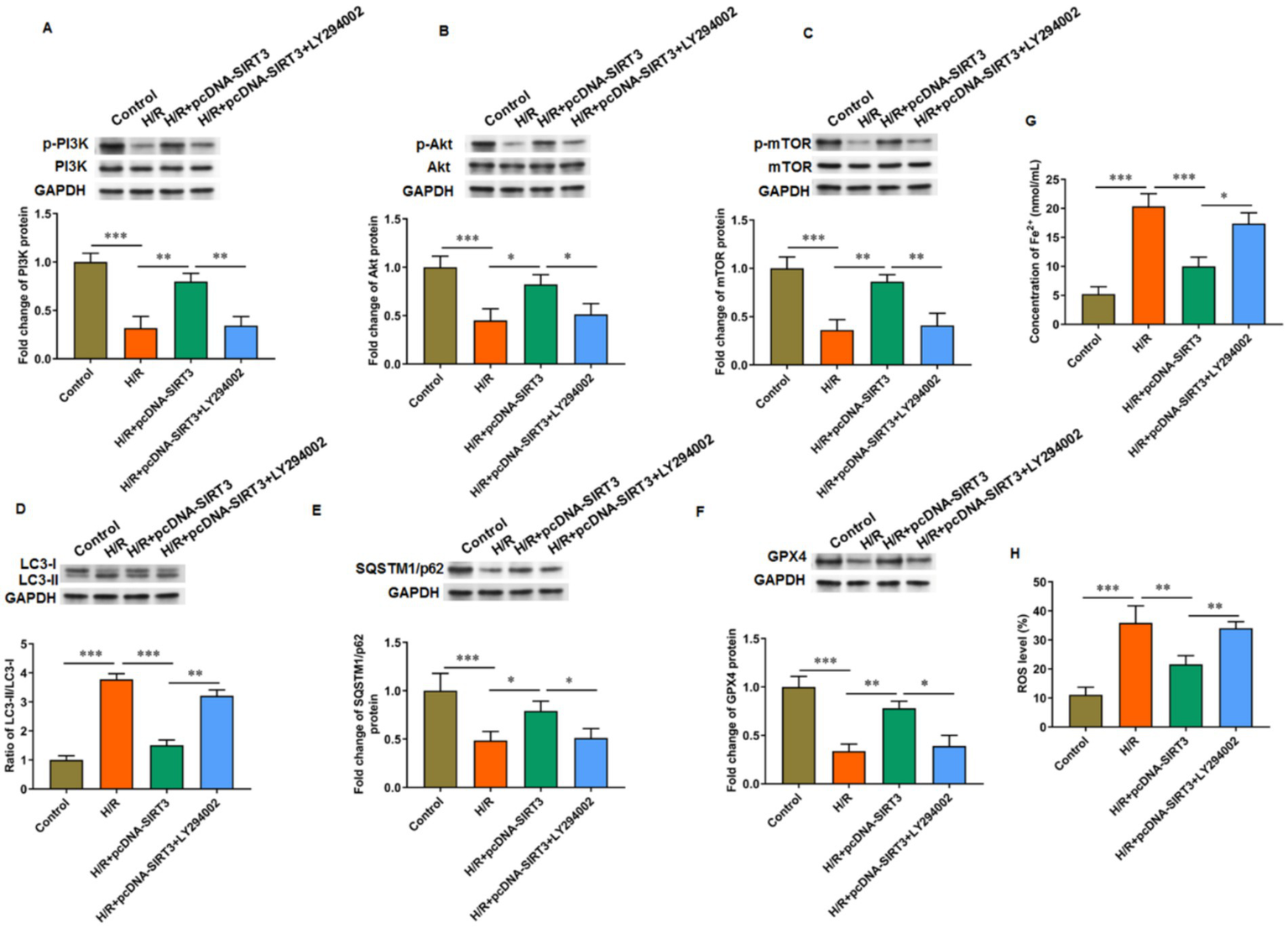SIRT3 inhibits H/R-induced autophagy and ferroptosis in HUVECs by activating PI3K/Akt/mTOR pathway. H/R-treated HUVECs were transfected with pcDNA-SIRT3 alone or co-treated with LY294002. (A–C) Phosphorylation levels of PI3K, Akt, and mTOR proteins. (D) Protein levels of LC-3II and LC-3I. (E) Protein levels of SQSTM1/p62. (F) Protein levels of GPX4. (G) Fe2+ content. (H) ROS levels. LY294002 was used to inhibit PI3K activation (N = 3). *p < 0.05, **p < 0.01, and ***p < 0.001.