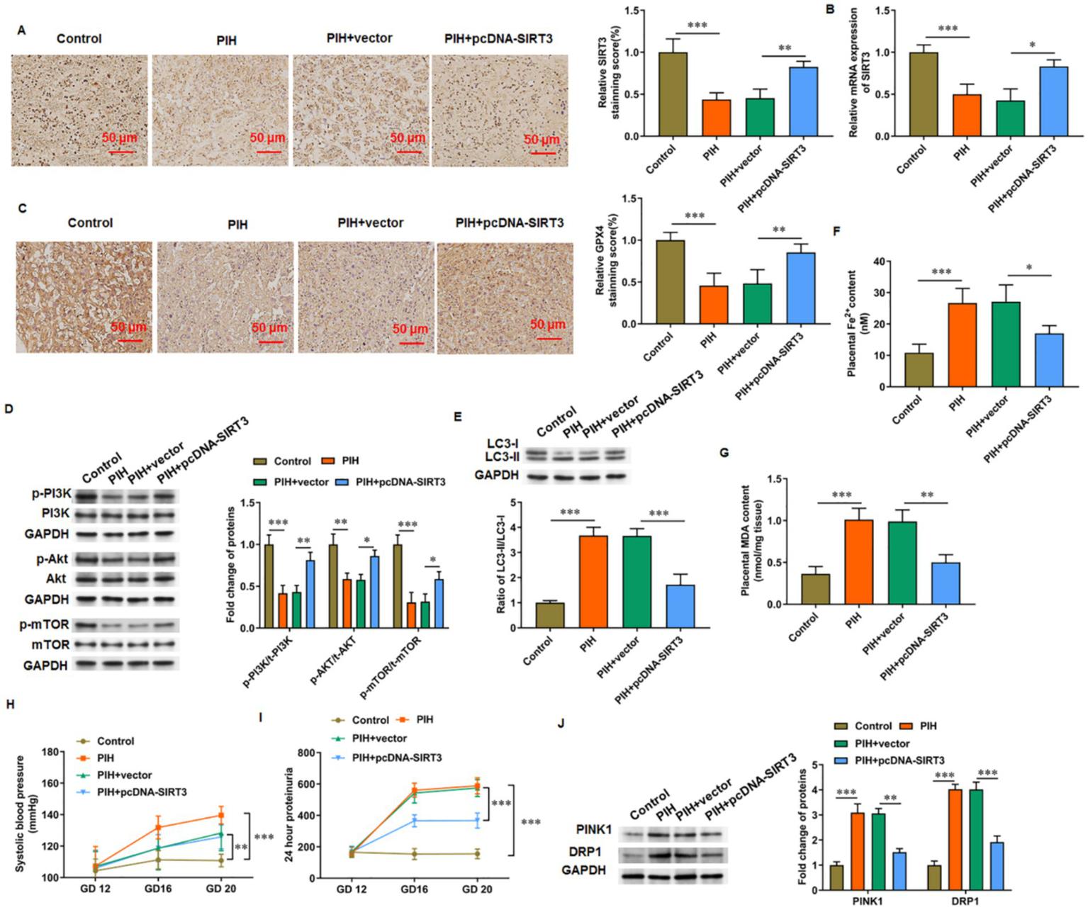 SIRT3 delays PIH progression in rats. (A,B) SIRT3 levels was detected by immunohistochemistry and RT-qPCR. (C) Representative immunohistochemical images of GPX4. Scale bar = 50 μm. (D) Phosphorylation levels of PI3K, Akt, and mTOR proteins. (E) Protein levels of LC-3II and LC-3I. (F) Fe2+ content. (G) MDA content. (H) Systolic blood pressure. (I) 24-h urinary protein content. (J) Protein levels of PINK1 and DRP1 (N = 3). *p < 0.05, **p < 0.01, and ***p < 0.001.