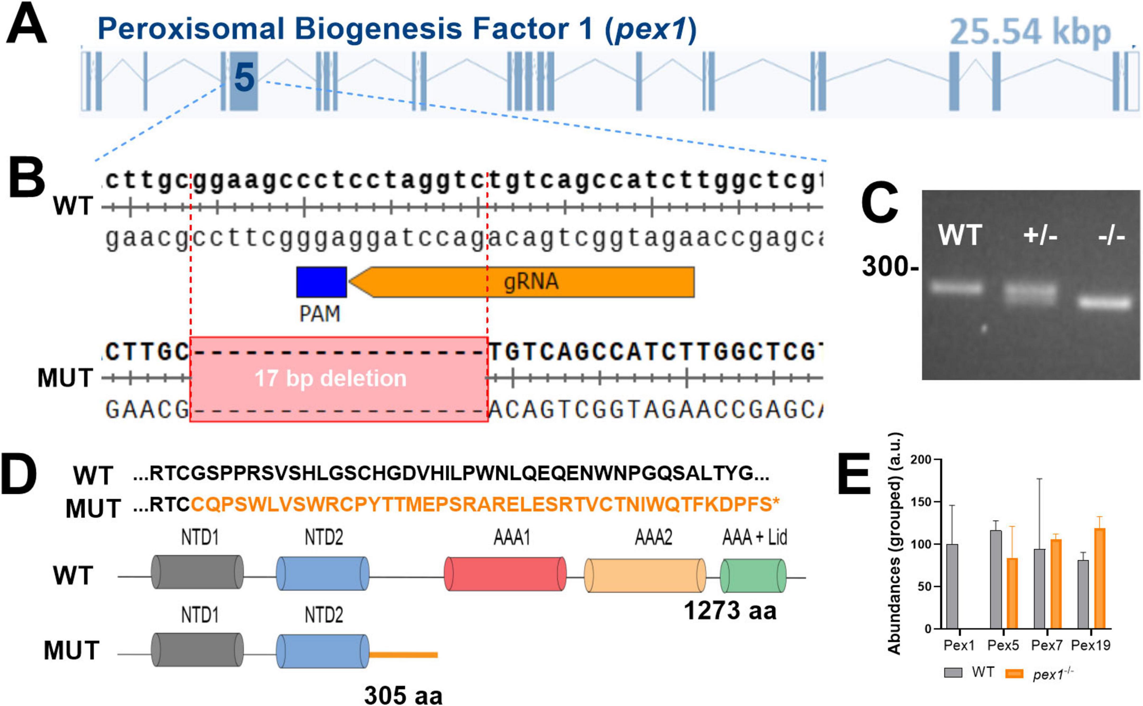Figure 1. Generation of a pex1 zebrafish model by CRISPR/Cas9. (A,B) Targeting CRISPR sites in exon 5 of the zebrafish pex1 gene induced a 17 bp-deletion leading to a premature stop codon (MUT). (C) PCR on genomic DNA allows genotyping: wild-type (WT, 290 bp), heterozygous, and homozygous mutant (273 bp). (D) Amino-acid sequences of wildtype (WT, 1273 aa) versus mutated Pex1 protein (MUT, 305 aa), which is predicted to lack the AAA-ATPase domains essential for Pex1 function. The altered amino acid sequence resulting from the frameshift mutation is indicated in orange. (E) Proteomics-based analysis of Pex protein levels in livers from 7-month-old WT and pex1–/– zebrafish (data are means ± % CV for n = 3 biological replicates).