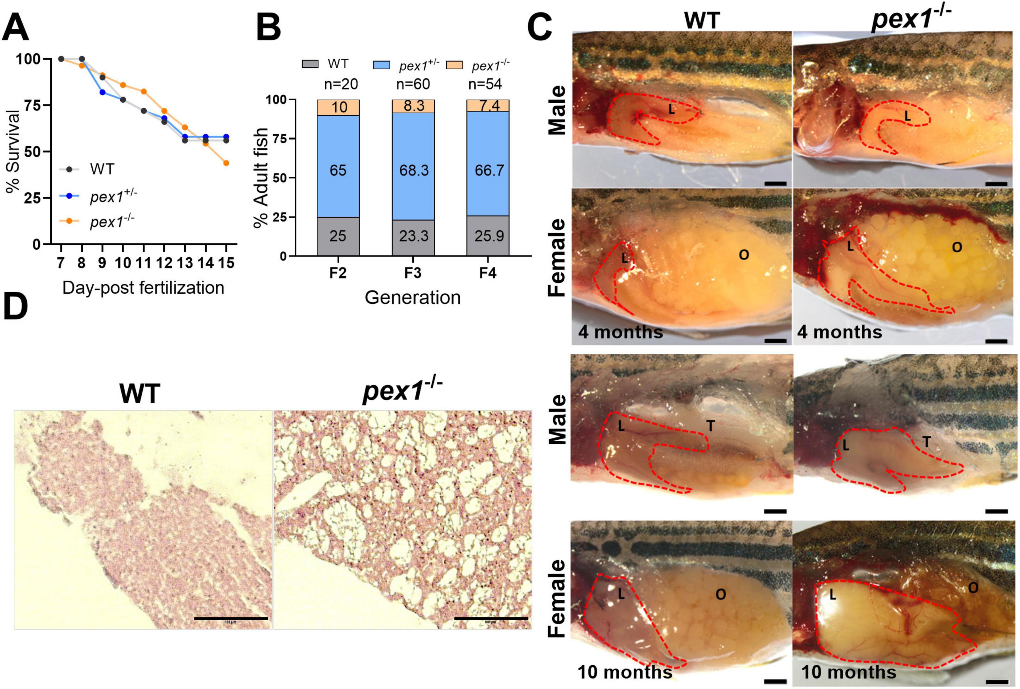 Figure 2. Survival and phenotypic characterization of the pex1 mutant zebrafish line. (A) Survival curves up to 15 days post-fertilization (dpf) (n = 50). (B) Percentage of wild-type (WT), heterozygous (pex1+/–), and homozygous (pex1–/–) mutant offspring reaching adulthood from F2 to F4 generations. (C) For organ morphology characterization, ten and five animals per genotype were dissected at 4 and 10 months, respectively. Representative post-mortem images of WT and pex1–/– female and male fish showing hepatic steatosis already at 4 months. Example of degenerated ovaries [O] and enlarged fatty liver in a 10-month-old female. Testis are indicated by a [T] in 10-month-old males. (D) H&E staining of liver sections from 7-month-old female fish revealed vacuolization in pex1–/– samples (the images are representative of 2 biological replicates). Scale bars represent 100 μm in (C,D).