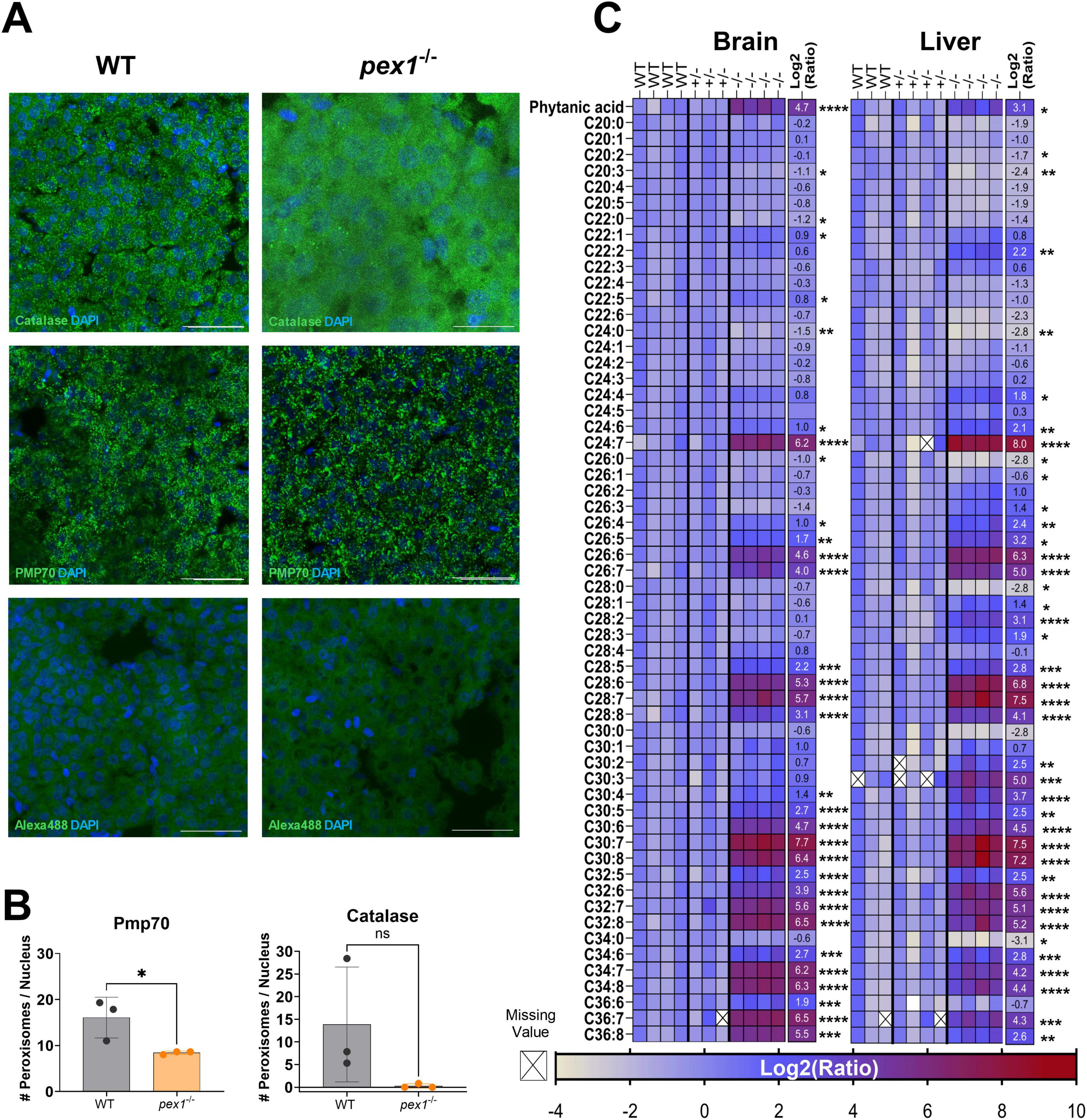 Figure 3. Peroxisome biogenesis is compromised in adult pex1 zebrafish. (A) Confocal images of 5 μm liver sections from 7-month-old wild-type (WT) and pex1–/– fish stained for catalase (peroxisomal matrix marker) or PMP70 (peroxisomal membrane marker). WT hepatocytes display numerous punctate peroxisomes, whereas pex1–/– cells show a more diffuse catalase staining and fewer PMP70-positive puncta. Representative images were generated using Maximum Intensity Projection of the entire z-stack to enhance peroxisomal contrast. Secondary-antibody-only controls (Alexa488) verify staining specificity. Nuclei were counterstained with DAPI (cyan). Scale bars, 2 μm. (B) Quantification of peroxisome counts using Average Intensity Projection data. Bars represent means ± SD from three biological replicates (one section per fish; n = 3). Unpaired, two-tailed Student’s t-test: *p < 0.05; ns, not significant. (C) Heat-map of indicated fatty acid profiles measured by LC-MS in brain and liver of individual 7-month-old WT, pex1+/–, and pex1–/– fish. The numerical values shown on the right correspond to KO/WT log2 ratios and represent means of 3–4 biological replicates. Crosses on white background indicate missing values. Multiple unpaired Student’s t-test: *p < 0.033, **p < 0.0021, ***p < 0.0002, ****p < 0.0001.