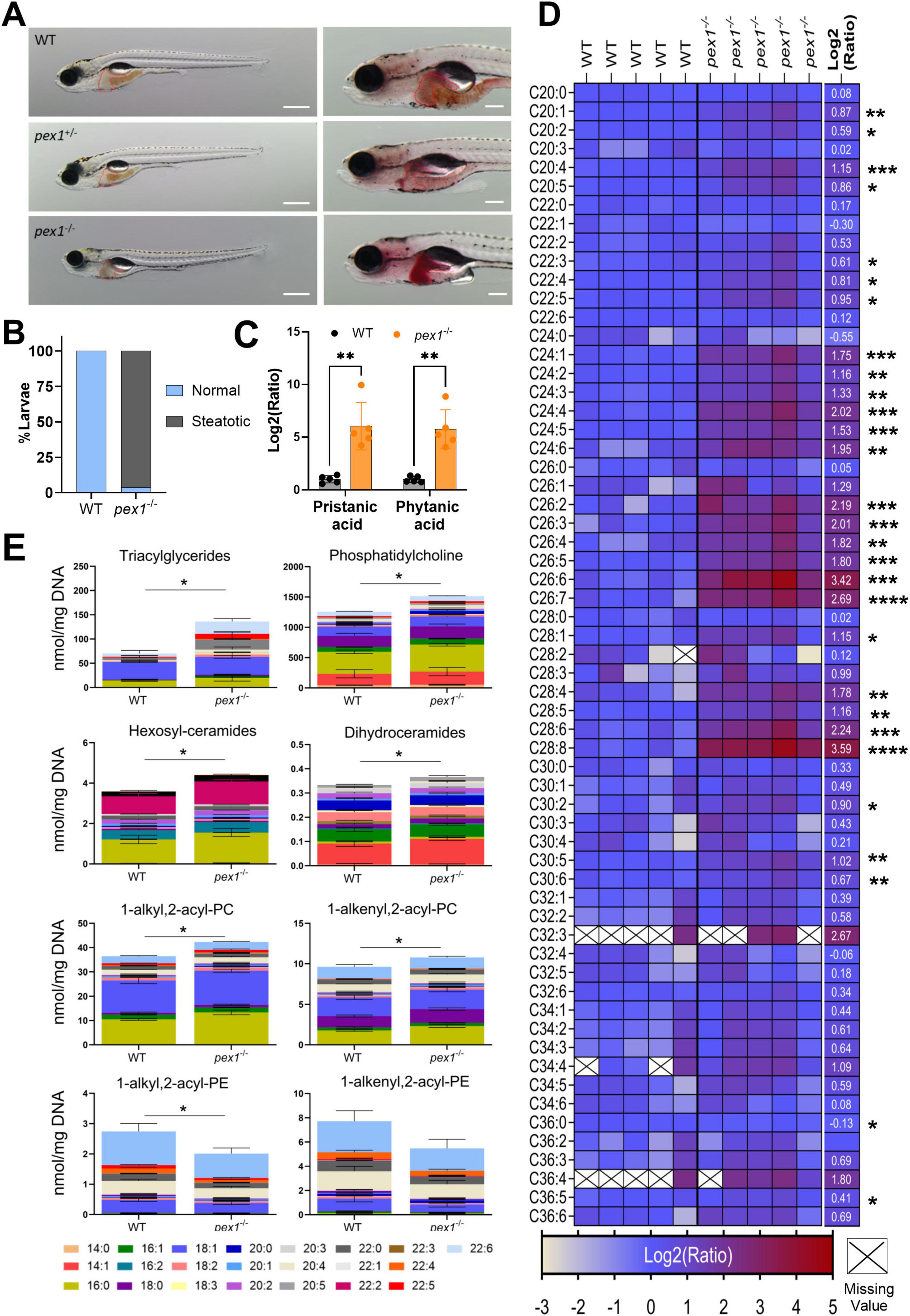 Figure 4. Liver steatosis and lipid dyshomeostasis manifest during early development in pex1 mutant larvae. (A) Brightfield (left) and Oil-Red O (ORO) staining (right) of 13 dpf zebrafish larvae. Robust neutral-lipid accumulation is confined to the liver of pex1–/– larvae compared with wild-type (WT) and heterozygous siblings. Scale bar, 1 mm. (B) Incidence of ORO-positive (steatotic) livers at 13 dpf; n = 20 larvae per genotype. (C) Log2 fold change of pristanic and phytanic acid in pex1–/– versus WT larvae at 13 dpf measured by LC-MS in whole-larva extracts. Bars represent means ± SDs of five independent replicates, each replicate being a pool of five larvae (n = 5). (D) Heatmap of fatty acid (FA) species profiled by LC-MS. Columns represent biological replicates (pools of five larvae at 11 dpf); rows represent individual FAs. The numerical values on the right correspond to KO/WT log2 ratios and statistical significance was assessed with multiple unpaired Student’s t-test: *p < 0.033; **p < 0.0021, ***p < 0.0002, ****p < 0.0001. Crosses on white background indicate missing values. (E) Stacked bar plots of the FA composition of the indicated lipid classes determined by targeted lipidomics at 13 dpf. Data are means ± SDs of five biological replicates (pools of 15 larvae) normalized to DNA content. Statistical significance in panels C,E was assessed with an unpaired Welch’s t-test (WT vs. pex1–/–). *p < 0.033; **p < 0.0021, ***p < 0.0002, ****p < 0.0001.