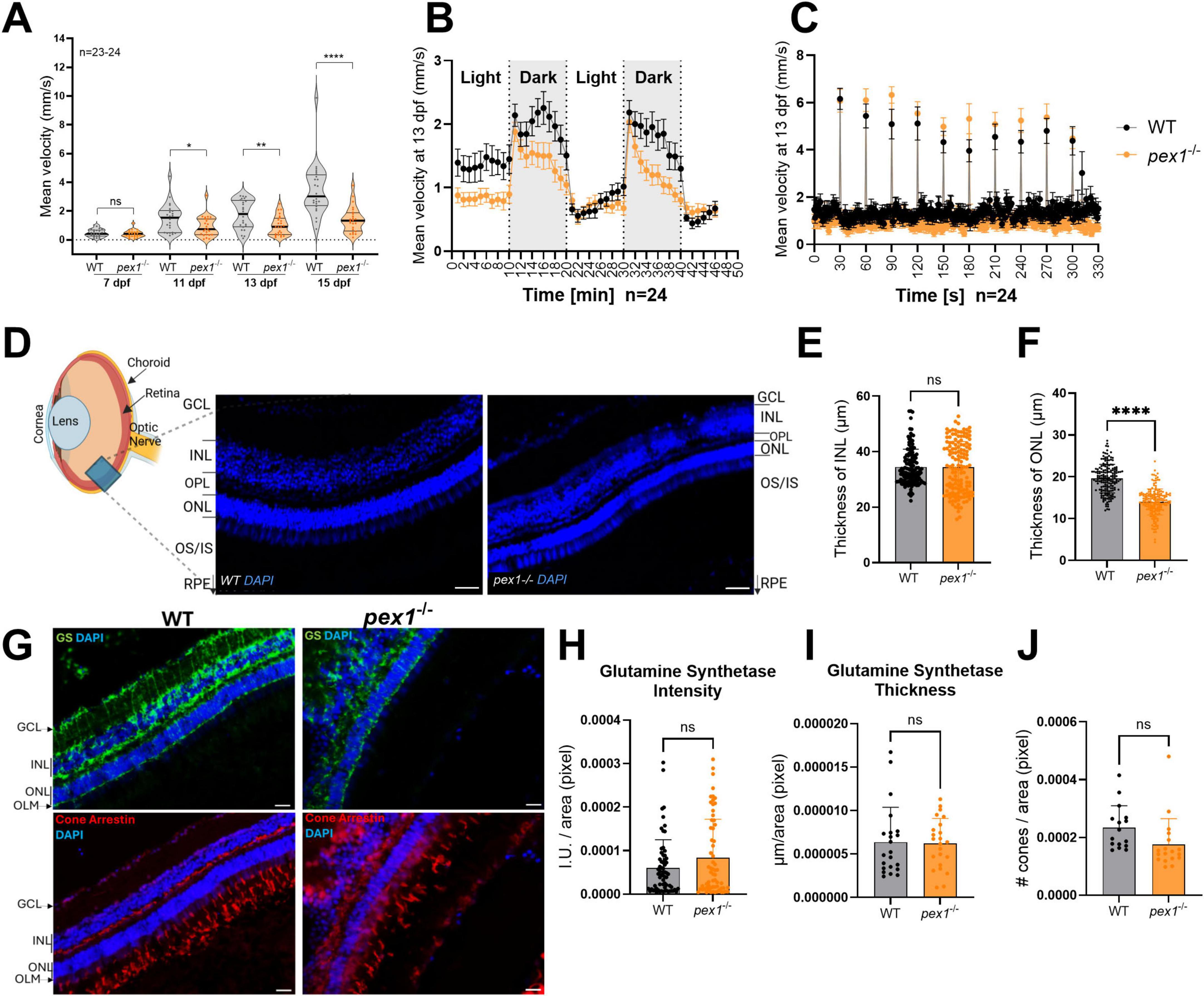 Figure 6. Pex1 deficiency leads to behavioral changes in larvae and perturbed retinal architecture in adult fish. (A) The total mean velocity of 7, 11, 13, and 15 dpf larvae was recorded under constant light conditions for 1 hr. Each dot represents the mean velocity of one larva (n = 23–24). (B) Behavioral profiles (1-min intervals) of 13 dpf larvae under alternating light/dark conditions in 10-min interval cycles. (C) Startle response profile (1-sec intervals) of 13 dpf larvae upon acoustic stimuli applied in 30-sec intervals. Each dot in (B,C) represents the mean velocity (± SEM) of 24 larvae recorded on two independent plates. Statistical significance in (A) was determined by unpaired t-test (*p < 0.033; **p < 0.0021, ****p < 0.0001). (D) Zebrafish eye representation showing DAPI counterstaining of nuclei (blue) across the retinal layers—GCL, INL, OPL, and ONL—in 7-month-old animals. Scale bars represent 10 μm. (E,F) Six measurements were taken from six images per eye, with three images on each side of the optic nerve. For each side, these three images were positioned equidistant from the optic nerve. Each dot represents an individual measurement. Values are presented as means ± SDs; statistical analysis was performed using an unpaired t-test (****p < 0.0001). (G) Glutamine synthetase (GS; green) and cone arrestin (red) immunostaining highlighting Müller glial and cone cells, respectively. Scale bars represent 5 μm. (H,I) Quantification of Müller cell fluorescence intensity and cell layer thickness (μm) normalized to Müller cell area (operationally defined as the area within the retinal section that shows positive GS labeling). Measurements were taken from three images lateral to the optic nerve on both left and right sides (6 images/eye). The Müller cells were delineated based on GS staining from the outer limiting membrane to the inner nuclear layer. Each dot represents a single measurement. (J) Normalized cone density (number of cones/area). Cones were automatically identified using a custom Matlab script, with manual correction for overlapping signals. Each dot represents one single image taken from three images lateral to the optic nerve, as described above. For (H–J), means ± SDs are shown and statistical analysis was performed using an unpaired t-test (ns, non-significant). Three (E,F) or four (H–J) eyes from different animals were analyzed per genotype. GCL, ganglion cell layer; INL, inner nuclear layer; OPL, outer plexiform layer; ONL, outer nuclear layer; OS/IS, outer/inner segment; RPE, retinal pigment epithelium; GS, glutamine synthetase; OLM, outer limiting membrane; I.U., intensity units.