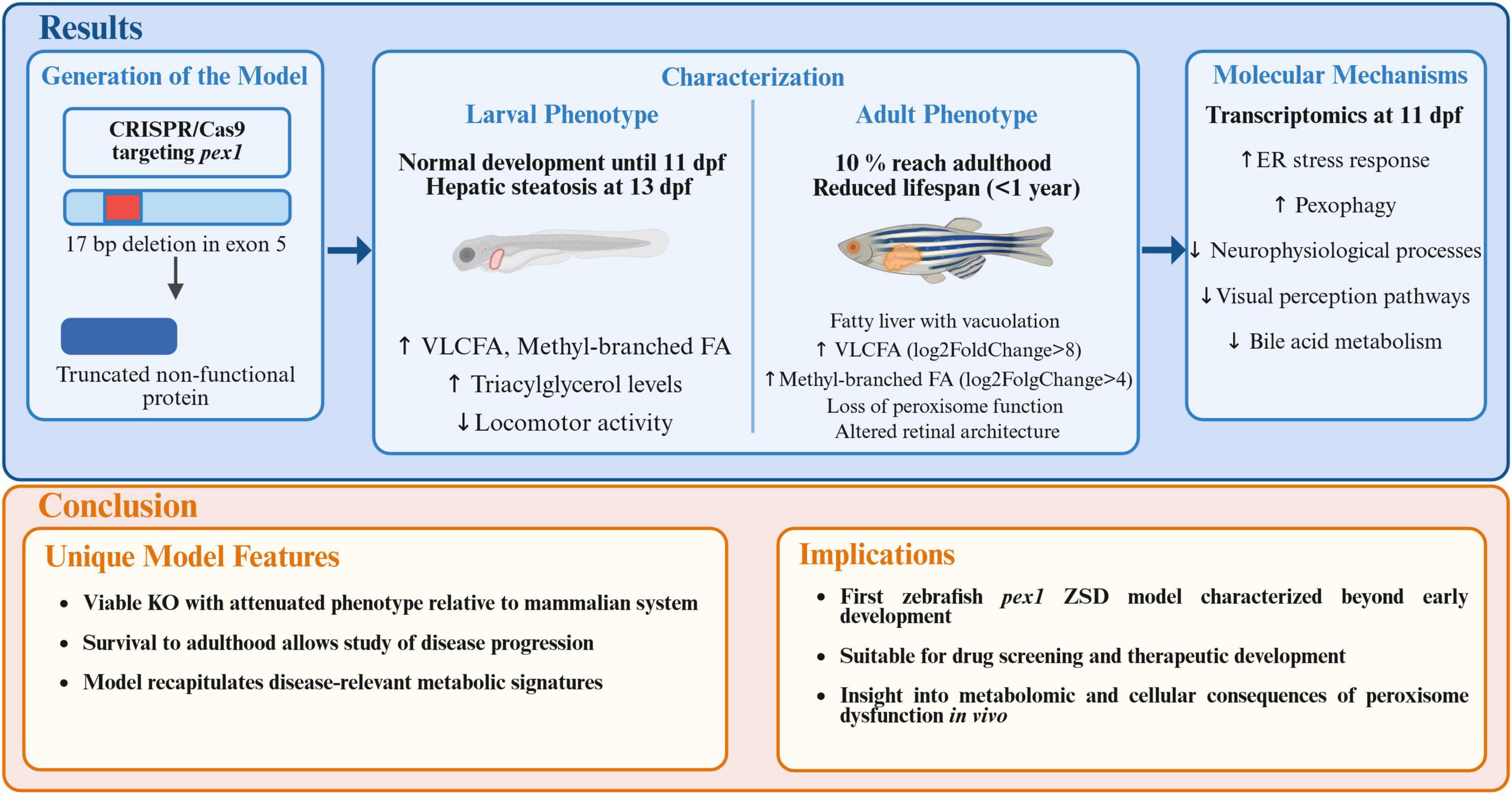 Overall, our pex1 zebrafish model recapitulates key metabolic and pathological features observed in ZSD patients. Intriguingly, however, Pex1 loss-of-function zebrafish do not exhibit the early lethality characteristic of mammalian models, but instead mirror phenotypes associated with milder forms of the disease spectrum. This attenuation may offer a distinct advantage for longitudinal in vivo studies aimed at dissecting the sequence of pathogenic events, which remains poorly understood in ZSDs. Furthermore, the small size and high fecundity of zebrafish make them well suited for developing drug screening assays, providing a valuable platform to identify urgently needed therapeutic strategies for these deleterious disorders.