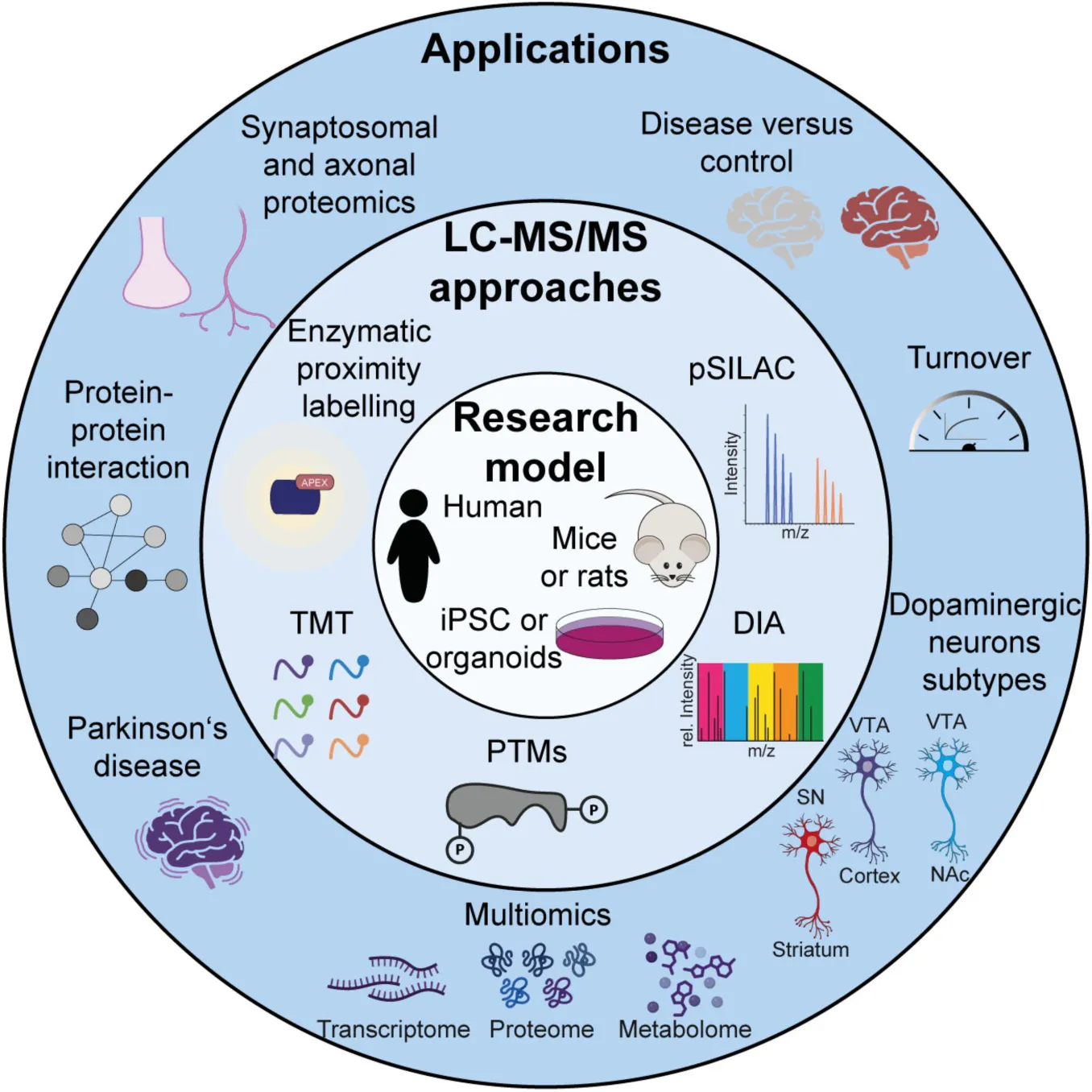 Overall, continuous advancements in proteomics technologies provide a key opening for future research on DA neurons. By directly measuring protein abundance and modification states, proteomics offers a functional readout of cellular processes that may not always be reflected at the transcriptomic level. Another significant advantage is the high-throughput and unbiased nature of mass spectrometry-based proteomics, which can identify and quantify thousands of proteins in a single experiment.