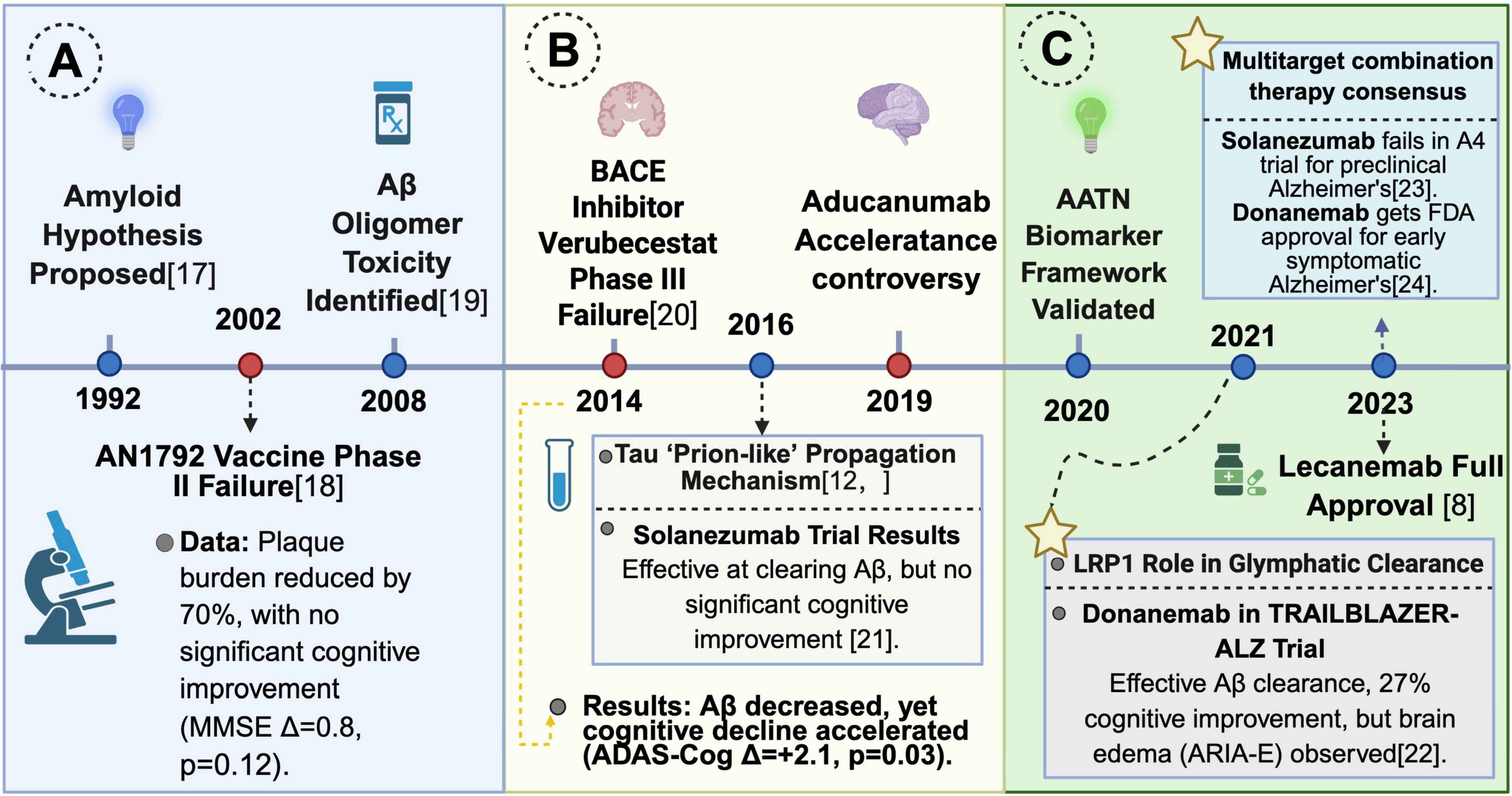 Figure 1. Key milestones and therapeutic advances in Alzheimer’s disease research. (A) Early discoveries and clinical trials (1992–2008). This panel highlights the proposal of the Aβ hypothesis (1992) (Hardy and Higgins, 1992), the failure of the AN1792 vaccine (2002) (Orgogozo et al., 2003), and the identification of toxic Aβ oligomers (2008) (Walsh et al., 2002). (B) Mechanistic insights and therapeutic challenges (2014–2019). This section covers the failure of the BACE inhibitor Verubecestat in phase III trials (2014) (Egan et al., 2018), the proposal of Aβ’s “prion-like” propagation (2014) (Jucker and Walker, 2018; Shi et al., 2021), and Solanezumab’s lack of cognitive benefit despite Aβ clearance (2016) (Honig et al., 2018). (C) Recent breakthroughs and FDA approval (2020–2023). Key events include Donanemab’s efficacy in clearing Aβ plaques with cognitive improvement but associated ARIA-E (2021) (Mintun et al., 2021), characterization of LRP1 receptor involvement in Aβ clearance (2021), Lecanemab’s full FDA approval for early symptomatic AD (2022) (van Dyck et al., 2023), and the outcomes of Solanezumab’s A4 trial and Donanemab’s FDA approval (2023) (Cummings et al., 2023; Sperling et al., 2023). Created in BioRender. Wang, W. (2025) https://BioRender.com/auqjm4v.