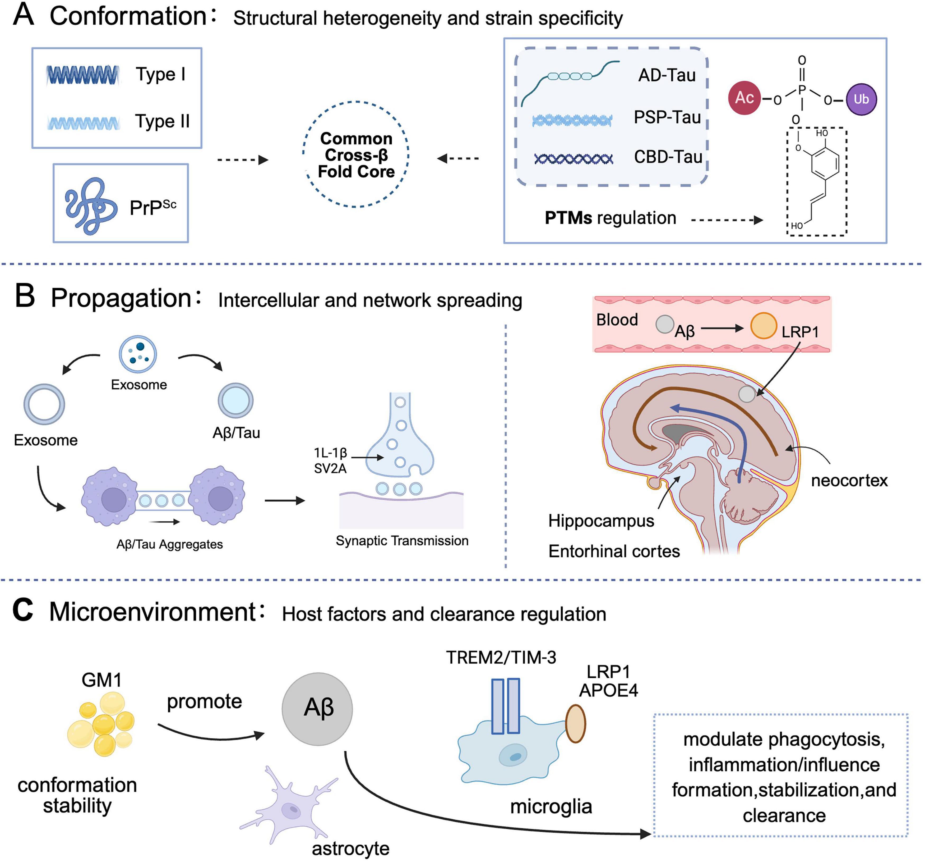 Figure 2. The conformation–propagation–microenvironment (CPM) framework in Alzheimer’s disease. This schematic integrates protein misfolding, spread, and host factors to model disease progression. (A) Conformation: pathogenic proteins (Aβ, tau, PrPSc) adopt distinct strains with unique cross-β-sheet structures, influencing propagation and toxicity. Cryo-EM reveals varied fibril architectures (e.g., Aβ42 Types I/II; tau C-shaped folds). PTMs (e.g., phosphorylation) modulate stability and pathogenicity (Ballatore et al., 2007; Bayer, 2022; Buchete and Hummer, 2007; Cabrera et al., 2018; Capocchi et al., 2024; Cummings et al., 2023; Gnoth et al., 2020; Gremer et al., 2017; Grochowska et al., 2017; Hardy and Higgins, 1992; Jucker and Walker, 2018; Kayed et al., 2003; Lauwers et al., 2020; Mamun et al., 2020; Shi et al., 2021; Tarutani et al., 2023a,b; Walsh et al., 2002; Woerman et al., 2016; Zhang et al., 2020). (B) Propagation: pathology spreads via exosomes, tunneling nanotubes, and synaptic connections. Tau propagates trans-synaptically along functional networks. Impaired clearance mechanisms (e.g., LRP1 dysfunction) promote Aβ accumulation (Cebecauer et al., 2017; Condello et al., 2020; DeVos et al., 2017; Harrison et al., 2020; Kim et al., 2020; Kong et al., 2021; Li N. et al., 2022; Liu et al., 2017; Malek-Ahmadi et al., 2020; Notario Manzano et al., 2024; P et al., 2022; Pontecorvo and Mintun, 2011; Roemer-Cassiano et al., 2025; Serrano-Pozo et al., 2021; Soliman et al., 2021; Soto et al., 2002; Therriault et al., 2022). (C) Microenvironment: host factors such as GM1 ganglioside, LRP1/APOE4, and microglial receptors (e.g.,TREM2) influence aggregation, clearance, and neuroinflammation (Atarashi et al., 2011; Congdon et al., 2023; Desai et al., 2025; Li Y. et al., 2022; Palmqvist et al., 2020; Pontecorvo and Mintun, 2011; Sims et al., 2023; Soto et al., 2002; Tennant et al., 2020). Core concept: misfolded proteins template conformational change in native counterparts, enabling self-replication and disease progression (Jucker and Walker, 2018; Peng et al., 2020; Shi et al., 2021; Soto, 2003). Created in BioRender. Wang, W. (2025) https://BioRender.com/leokh6q.