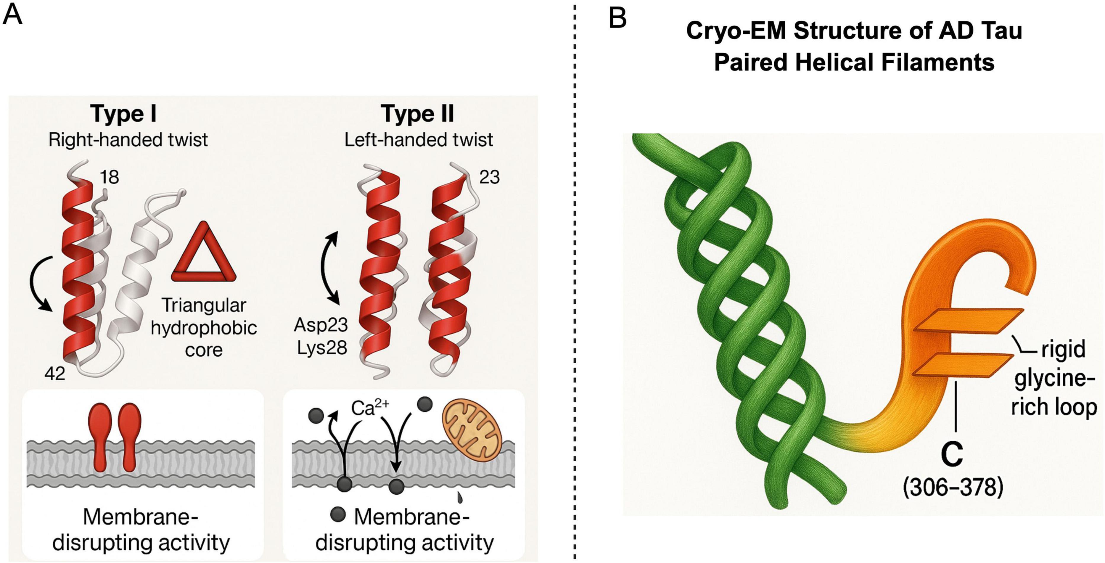 Figure 3. Structural Features of Aβ42 Fibril Polymorphs and Tau Protein. Panel A illustrates two main conformations of Aβ42 fibrils-Type I (right-handed twist) and Type II (left-handed twist). These types exhibit distinct core folding patterns (e.g., a triangular hydrophobic core) and specific amino acid residues (such as Asp23 and Lys28), These features lead to different biological activities, primarily membrane disruption. Panel B presents the Cryo-EM structure of AD tau, highlighting its paired helical filaments (PHFs) and the unique C-terminal structure (residues 306–378). This structure features parallel β- sheets connected by a glycine-rich loop, offering insights into the molecular mechanisms of tau aggregation in Alzheimer’s disease. Created in BioRender. Wang, W. (2025) https://BioRender.com/m90zv80.