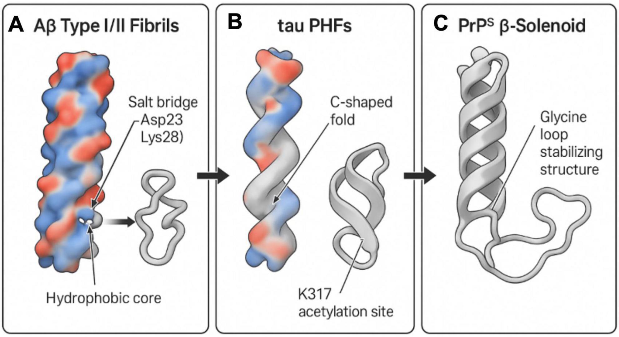 Figure 4. Structural comparison of Aβ, tau, and PrPSc fibrils using Cryo-EM. This diagram illustrates the structural features of amyloid fibrils from Aβ, tau, and prion proteins (PrPSc) based on Cryo-EM data. (A) Aβ type I/II fibrils: these display a hydrophobic core with a crucial salt bridge between Asp23 and Lys28, essential for fibril formation. (B) Tau paired helical filaments (PHFs): these exhibit a C-shaped fold and a significant acetylation site at K317, both contributing to fibril structural integrity. (C) PrPSc β-solenoid structure: stabilized by a glycine loop, this structure provides insight into the distinctive folding pattern of prion aggregates. The overall analysis highlights shared yet distinct features that underpin the prion-like mechanisms in neurodegenerative diseases. Created in BioRender. Wang, W. (2025) https://BioRender.com/z4ajr6f.