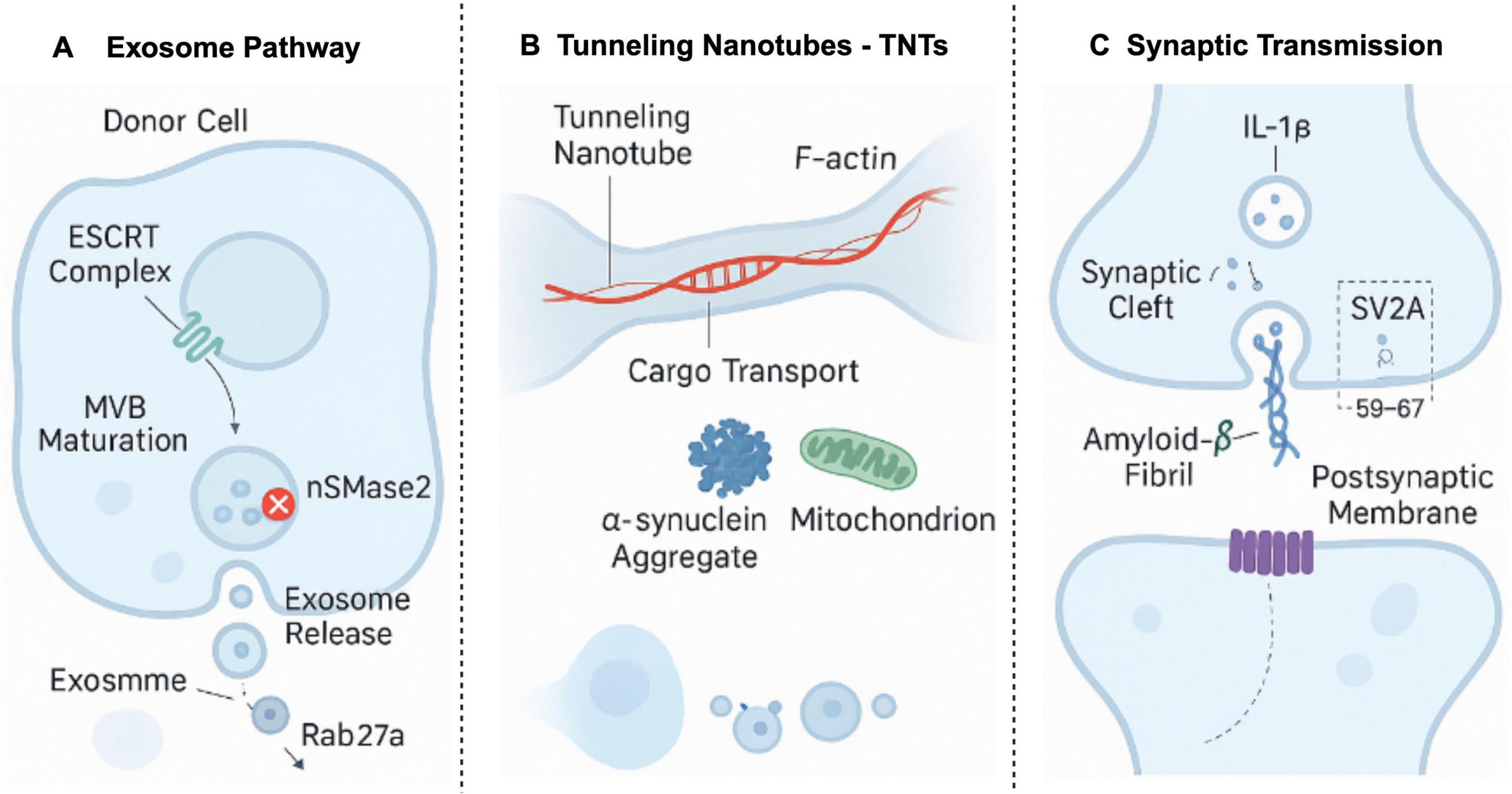 Figure 5. Multimodal pathological seed propagation mechanisms. This figure illustrates three primary mechanisms of pathological seed propagation: (A) exosome pathway: the ESCRT complex mediates the maturation of MVBs, with nSMase2 playing a key role in exosome release, and Rab27a regulates exosome transport; (B) tunneling nanotubes (TNTs): cargo, including α-synuclein aggregates and mitochondria, is transported through TNTs, driven by F-actin filaments; (C) synaptic transmission: amyloid-β fibrils propagate in the synaptic cleft, interacting with SV2A, and influencing the postsynaptic membrane. These pathways highlight the prion-like mechanisms involved in Alzheimer’s disease, providing insight into the spread of pathological seeds within neuronal networks. Created in BioRender. Wang, W. (2025) https://BioRender.com/p7ji4d7.