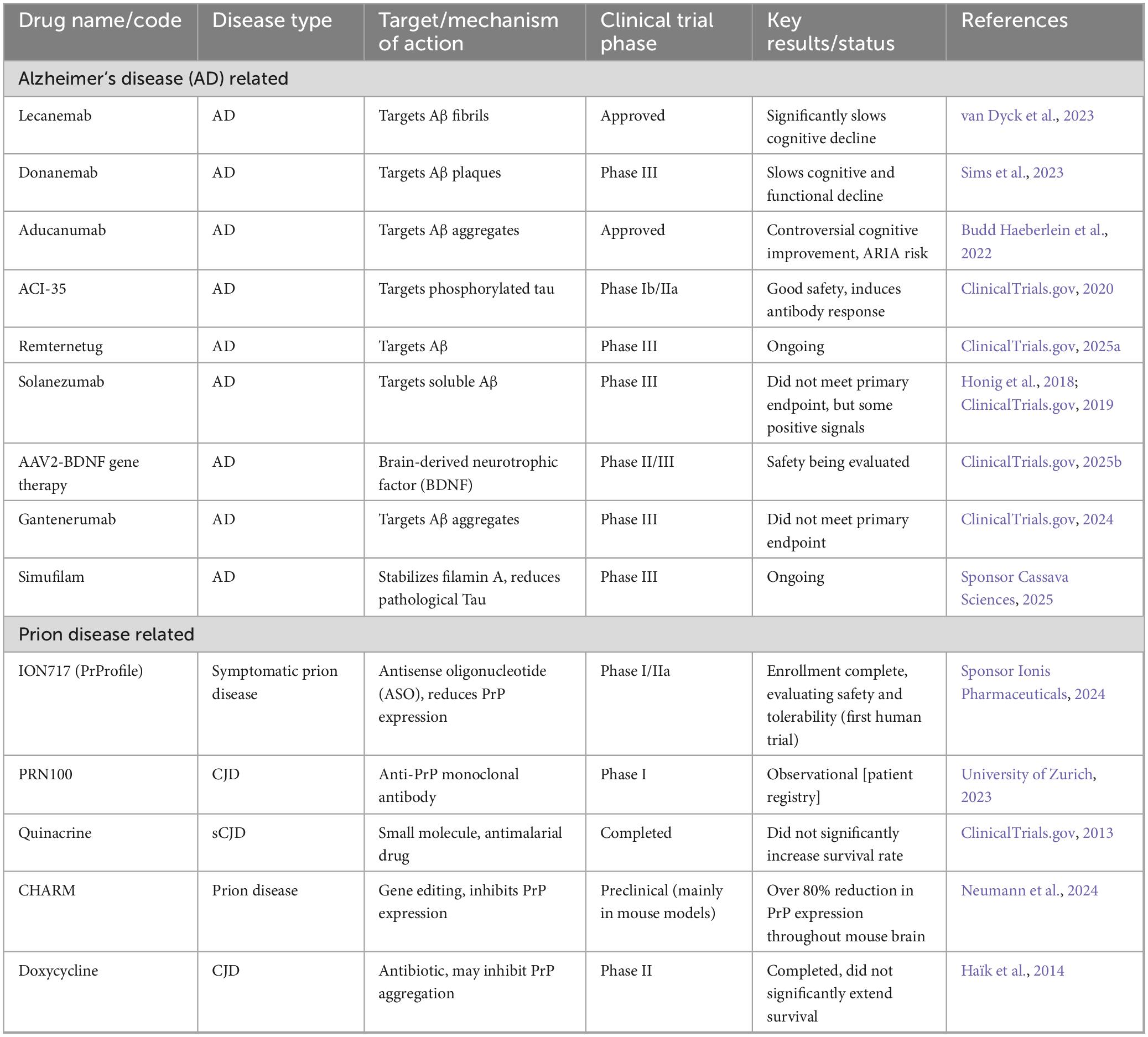 Recent advancements in technologies such as cryo-electron microscopy (cryo-EM) and molecular tracing have significantly deepened our understanding of Aβ and tau protein pathologies in AD. These investigations have revealed that the misfolding and aggregation of Aβ and tau proteins, particularly their soluble oligomeric forms, are primary neurotoxic entities. Critically, they exhibit self-templating propagation characteristics remarkably similar to PrPSc (Jucker and Walker, 2018; Shi et al., 2021; Castilla et al., 2008). Although the concept of protein misfolding as a central mechanism in neurodegenerative diseases was extensively explored and proposed by researchers like Soto and Kayed over a decade ago (Kayed et al., 2003; Soto, 2003), these recent breakthroughs have further propelled AD research beyond the traditional amyloid hypothesis toward a more comprehensive paradigm of “protein conformational disease.” The aberrant conformations of Aβ and tau, particularly their cross-β structure, possess the capacity not only for self-replication but also for exerting toxicity through trans-cellular propagation (Peng et al., 2020).