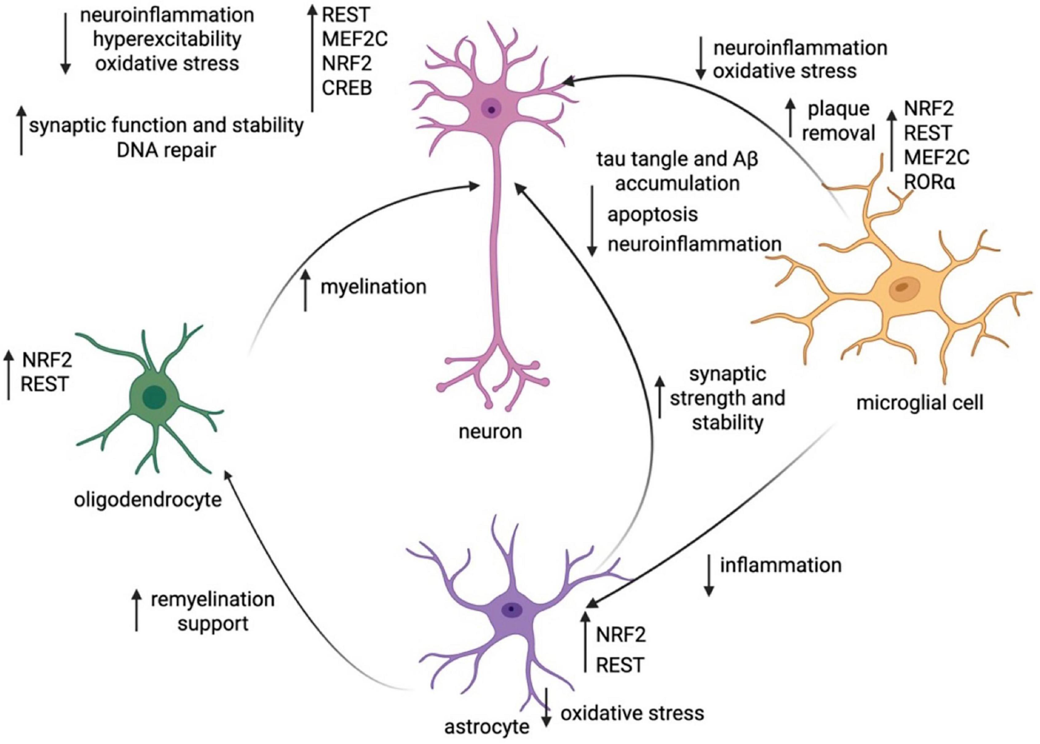 RE-1 silencing transcription factor also acts in multiple cell types. In neurons, it downregulates genes associated with pathogenic pathways (i.e., both those that are pro-apoptotic and those that are increasing Aβ and tau accumulation) (Aron et al., 2023). In microglia, it prevents release of pro-inflammatory cytokines, and similarly in astrocytes it represses the inflammatory markers that cause them to take on the neurotoxic phenotype (Yu et al., 2020; Huang et al., 2025). Moreover, in OPCs REST recruits histone deacetylases to repress genes that prevent differentiation, which increases myelination downstream (DeWald et al., 2011). Increased myelination by oligodendrocytes leads to higher neuronal energy efficiency and lower tau burden (Rubinski et al., 2022; Gerevich et al., 2023), and the repression of pro-inflammatory cytokines in microglia exerts downstream effects on reactive astrocytes that discourage transition to the neurotoxic state (Liddelow et al., 2017). Overall, due to a lowered number of disease-associated microglia and neurotoxic astrocytes, REST may play a role in reducing neurotoxicity (Huang et al., 2025; Edison, 2024).