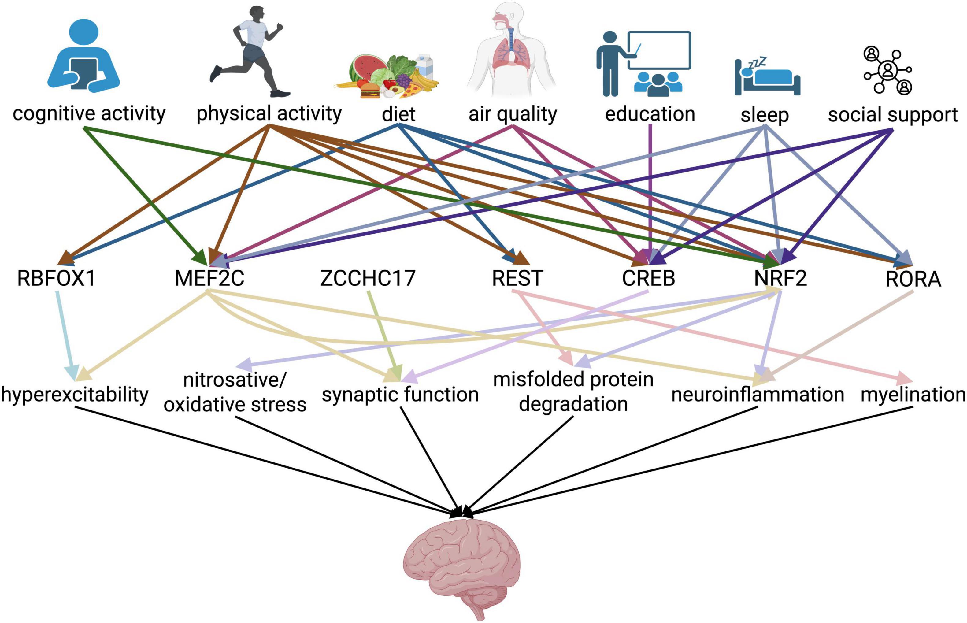 Here, we identify mechanistic links between most of the major lifestyle predictors of cognitive resilience and specific transcription factors that are implicated in cognitive resilience. This integrative model helps explain why factors previously treated as independent correlates such as education, physical activity, and diet consistently predict resilience; they likely converge on transcriptional regulators such as MEF2C, NRF2, CREB, REST, and RORα that counter the impact of pathological changes. More work on the elucidation of how environmental and social factors recruit biological mechanisms to afford neuroprotection will undoubtedly shed novel light on additional regulatory mechanisms that enable resilience.