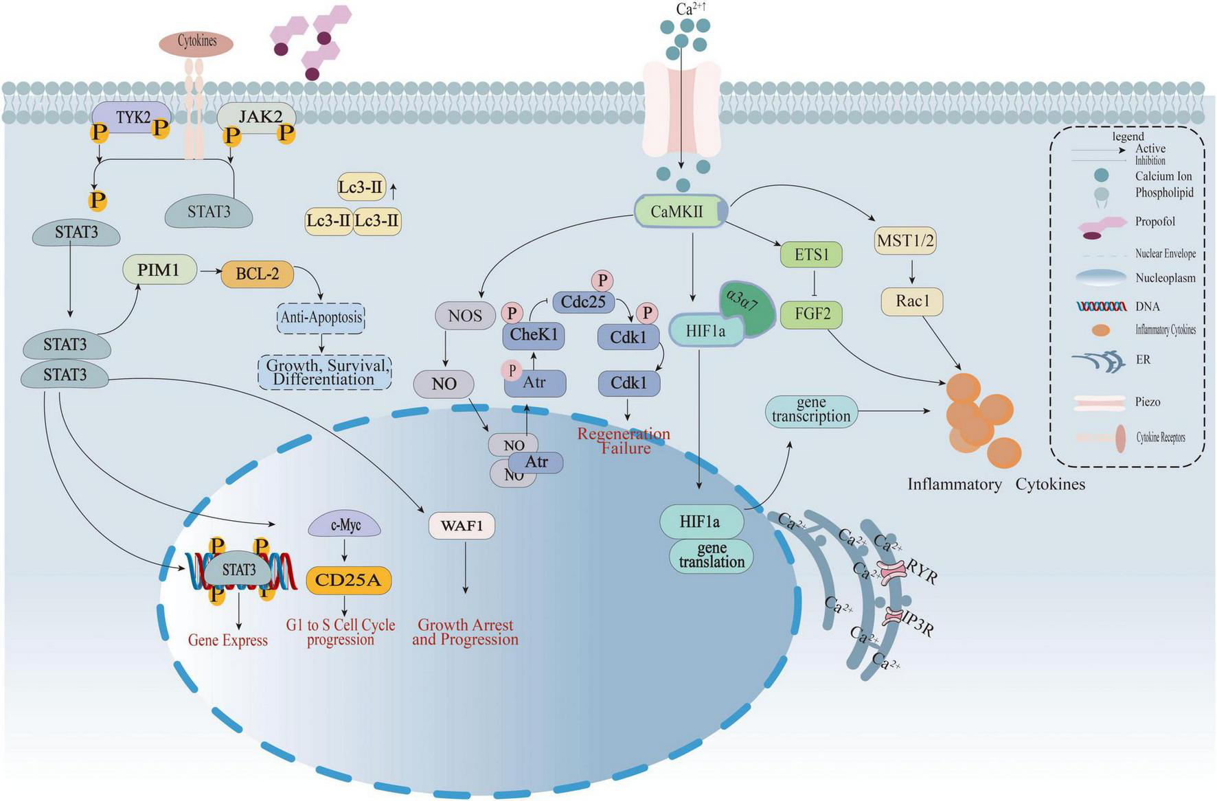 The diagram illustrates how propofol regulates calcium signaling, the JAK-STAT3 pathway, and cell cycle to interfere with inflammatory cytokine release, cell proliferation, and apoptosis. Left: Cytokine signaling—Cytokines bind to receptors, activating TYK2/JAK2 phosphorylation and driving STAT3 nuclear translocation. STAT3 regulates BCL-2 (anti-apoptosis), e-Myc/CD25A (G1-to-S phase progression), and WAF1 (growth arrest). Middle: Calcium signaling and cell cycle—Piezo channels mediate Ca2+ influx, activating CaMKII. This regulates HIF1α transcription/translation and, via abnormal CheK1/Cdk1 phosphorylation (involving Atr), induces regeneration failure. Right: Inflammatory cascade—Ca2+-CaMKII activates ETS1 and the MST1/2-Rac1 pathway, promoting inflammatory cytokine secretion. Propofol interferes with abnormal signaling by targeting membrane phospholipids and Piezo channels.