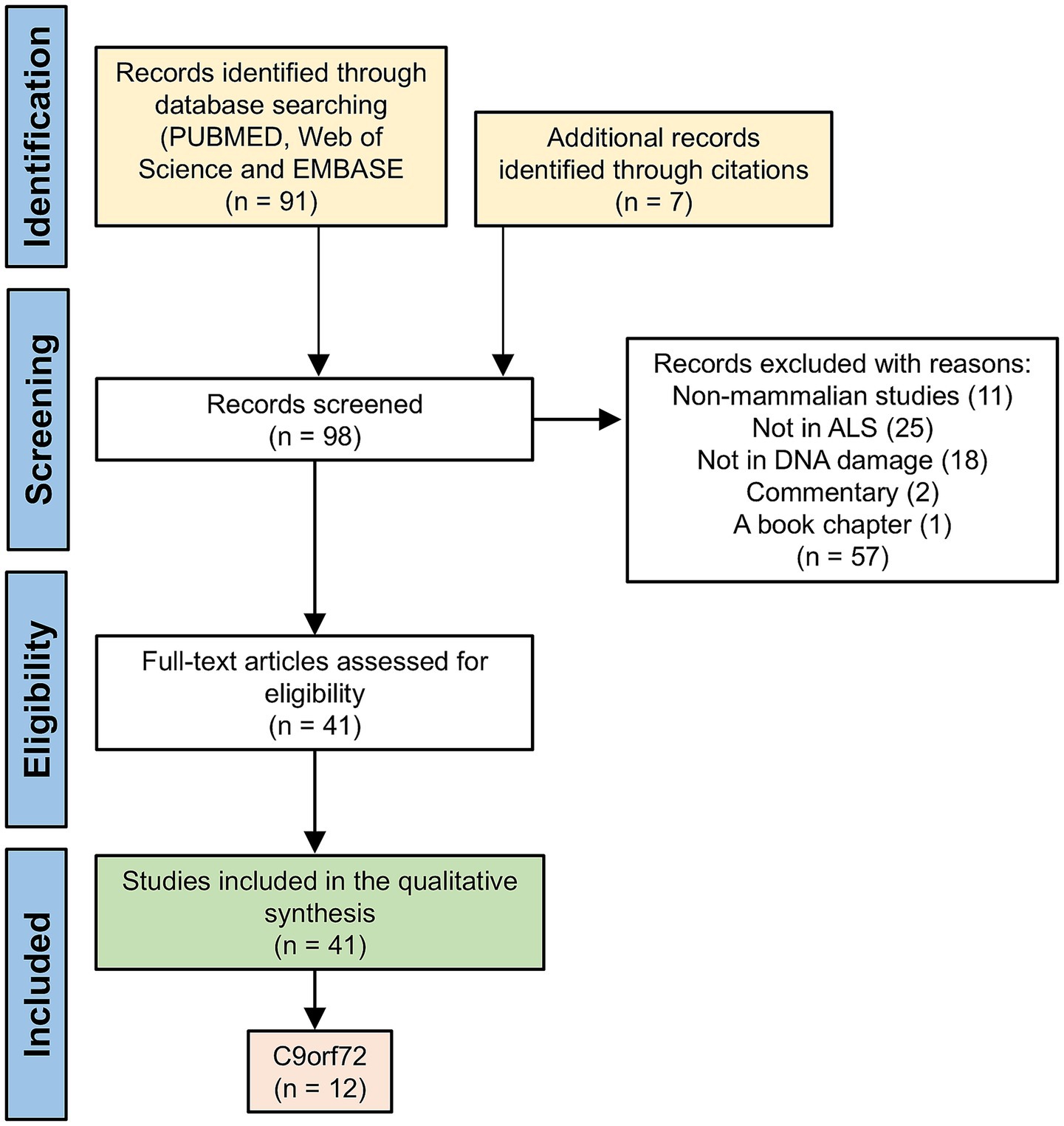 After removing duplicates, titles and abstracts were screened based on the following eligibility criteria: (1) the study used ALS or ALS-FTD associated genes; (2) the research focused, at least in part, on studying DNA damage, the DNA damage response (DDR), DNA repair pathway proteins, or manipulating genes or proteins associated with the DDR; and (3) studies were conducted in mammalian models or with patient-derived cells or tissue. Hence, studies using primarily non-mammalian models were excluded. Two studies on C9orf72-related ALS-FTD that used combinations of models: human induced pluripotent stem cell (iPSC) -derived neurons and Drosophila (Lopez-Gonzalez et al., 2019); and a mouse model, patient iPSC-derived neurons, and Drosophila (Maor-Nof et al., 2021), respectively. From these two studies, data related to the non-mammalian models, i.e., Drosophila, was excluded. Since inconsistencies in selection between the two authors (S. A. and ZA.) did not arise, resolution through discussion was not required. After the initial selection, we conducted a secondary screening of the bibliographies of included articles to identify additional relevant studies, which underwent the same selection process.