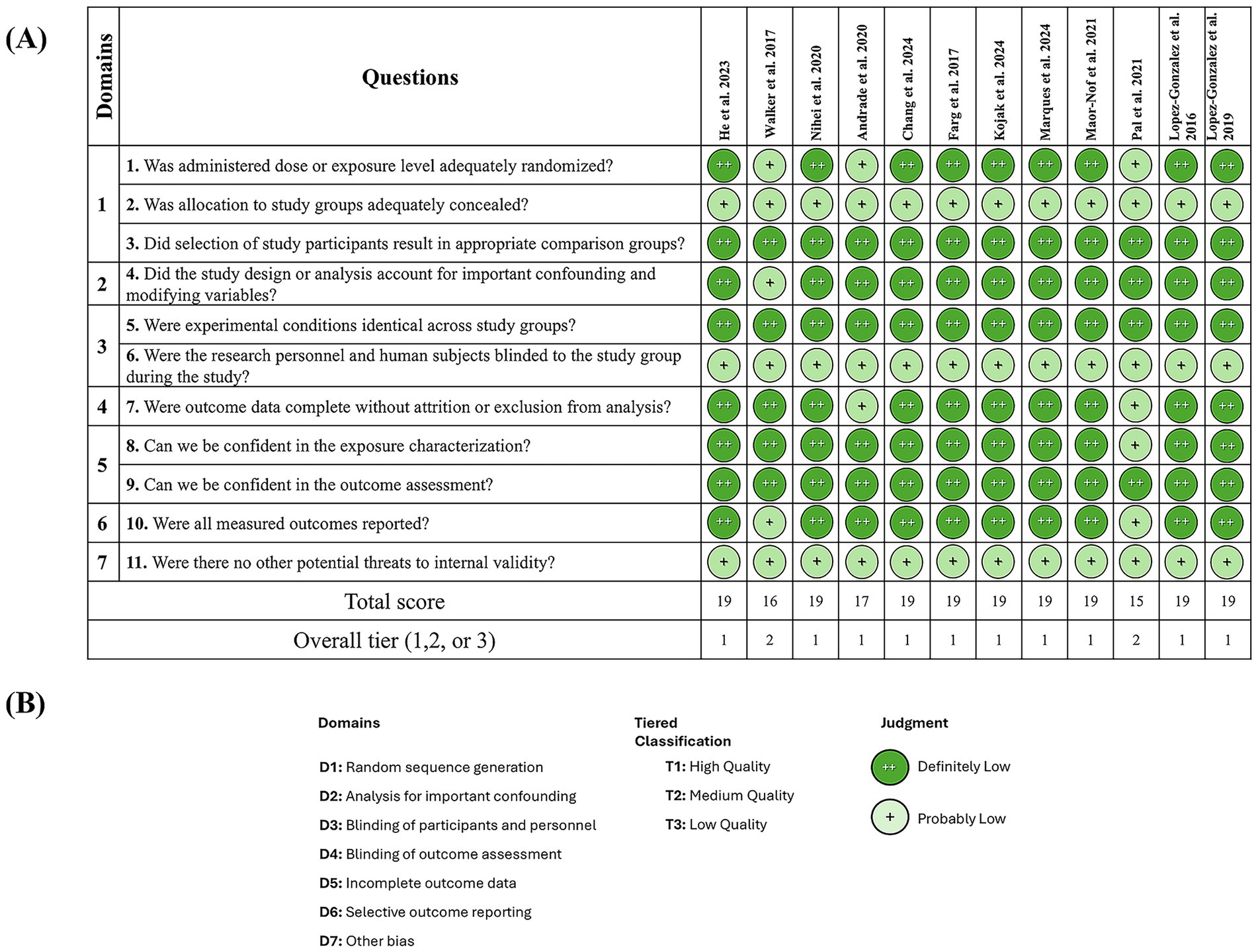 Figure 2. The OHAT tool for rating the risk of bias was used for the in vitro studies. (A) Risk of bias assessment across included studies. (B) Risk of bias domains and classification criteria.