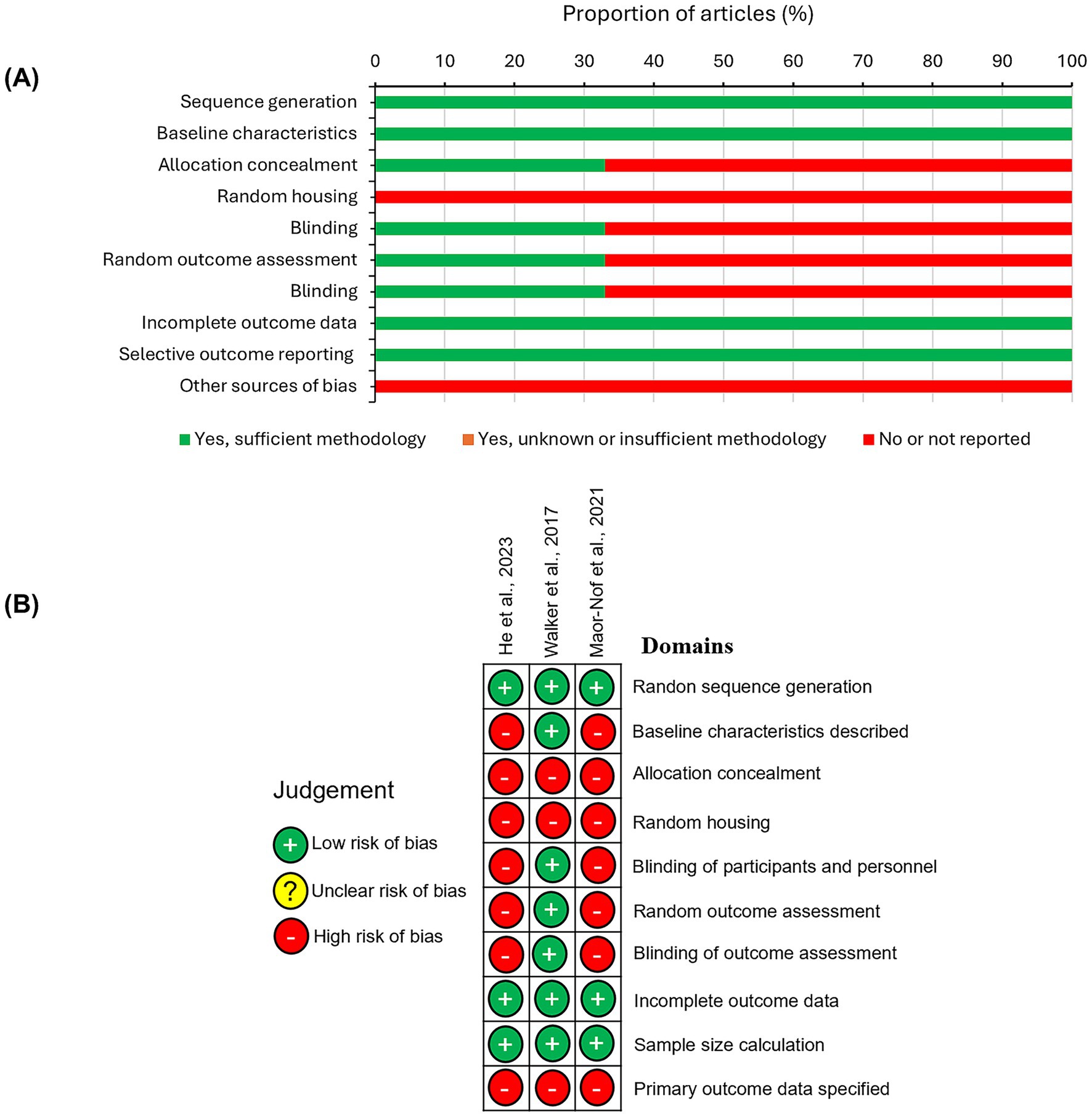 The SYRCLE RoB tool (Hooijmans et al., 2014) was used to assess the three in vivo studies (Walker et al., 2017; Maor-Nof et al., 2021; He et al., 2023) (Figure 3). Overall, these studies demonstrated a high risk of bias. None reported on random housing or specified primary outcome domains. Additionally, two of the studies did not report allocation concealment, blinding of participants and personnel, random outcome assessment, or blinding of outcome assessment.