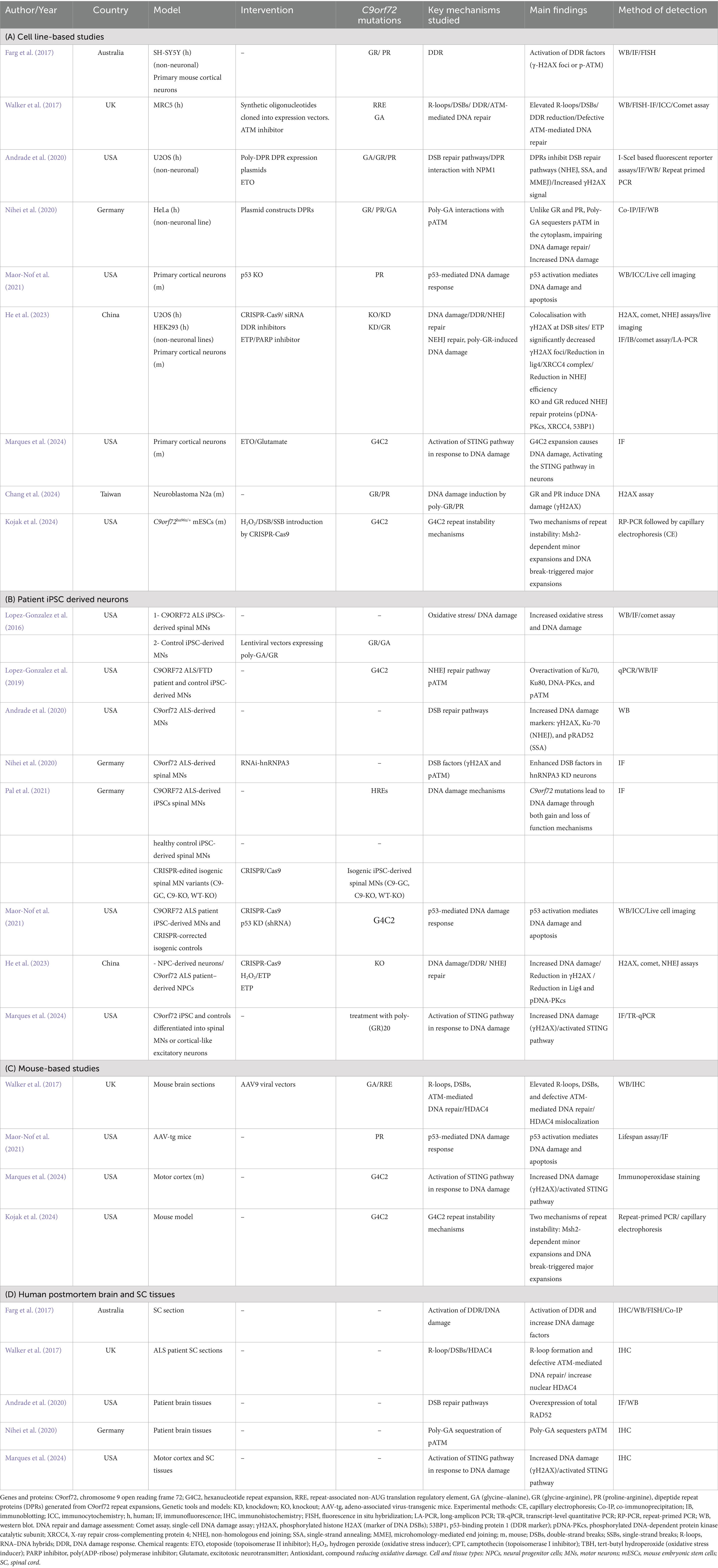 Of the 41 peer-reviewed publications, the C9orf72 gene was investigated in 12 studies, encompassing both in vitro and in vivo methodologies (Table 1). The 12 studies investigated the link between DNA damage and C9orf72 expansion and pathology mechanisms. The studies were published between 2016 and 2024, covering four continents: Asia (He et al., 2023; Chang et al., 2024), Europe (Walker et al., 2017; Nihei et al., 2020; Pal et al., 2021), Australia (Farg et al., 2017), and North America. Most studies were conducted in the USA (Lopez-Gonzalez et al., 2019; Maor-Nof et al., 2021; Lopez-Gonzalez et al., 2016; Andrade et al., 2020; Marques et al., 2024; Kojak et al., 2024).